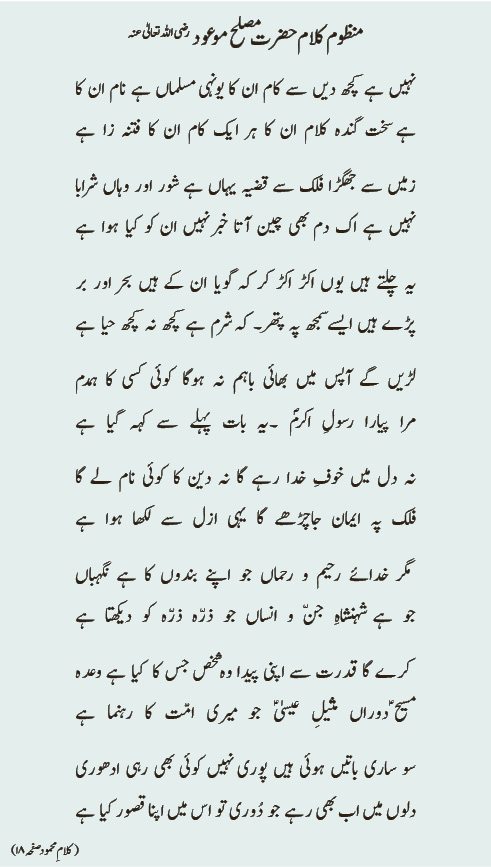 نہیں ہے کچھ دیں سے کام ان کا یونہی مسلماں ہے نام ان کا ہے سخت گندہ کلام ان کا ہر ایک کام ان کا فتنہ زا ہے زمیں سے جھگڑا فلک سے قضیہ یہاں ہے شور اور وہاں شرابا نہیں ہے اک دم بھی چین آتا خبر نہیں ان کو کیا ہوا ہے یہ چلتے ہیں یوں اکڑ اکڑ کر کہ گویا ان کے ہیں بحر اور بر پڑے ہیں ایسے سمجھ پہ پتھر۔ کہ شرم ہے کچھ نہ کچھ حیا ہے لڑیں گے آپس میں بھائی باہم نہ ہوگا کوئی کسی کا ہمدم مرا پیارا رسولِ اکرمؐ ۔یہ بات پہلے سے کہہ گیا ہے نہ دل میں خوفِ خدا رہے گا نہ دین کا کوئی نام لے گا فلک پہ ایمان جاچڑھے گا یہی ازل سے لکھا ہوا ہے مگر خدائے رحیم و رحماں جو اپنے بندوں کا ہے نگہباں جو ہے شہنشاہِ جنّ و انساں جو ذرّہ ذرّہ کو دیکھتا ہے کرے گا قدرت سے اپنی پیدا وہ شخص جس کا کیا ہے وعدہ مسیح ؑدوراں مثیلِ عیسیٰؑ جو میری امّت کا رہنما ہے سو ساری باتیں ہوئی ہیں پوری نہیں کوئی بھی رہی ادھوری دلوں میں اب بھی رہے جو دُوری تو اس میں اپنا قصور کیا ہے (کلامِ محمود صفحہ۱۸)