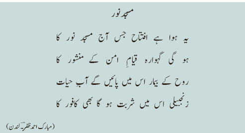 یہ ہوا ہے افتتاح جس آج مسجد نور کا ہو گی گہوارہ قیامِ امن کے منشور کا روح کے بیمار اس میں پائیں گے آبِ حیات زنجبیلی اس میں شربت ہو گا بھی کافور کا (مبارک احمد ظفرؔ۔ لندن)