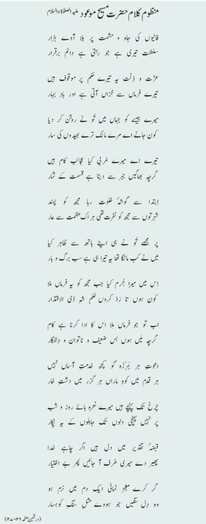 فانیوں کی جاہ و حشمت پر بلا آوے ہزار سلطنت تیری ہے جو رہتی ہے دائم برقرار عزّت و ذِلّت یہ تیرے حکم پر موقوف ہیں تیرے فرماں سے خزاں آتی ہے اور بادِ بہار میرے جیسے کو جہاں میں تُو نے روشن کر دیا کون جانے اے مرے مالک ترے بھیدوں کی سار تیرے اے میرے مُربی کیا عجائب کام ہیں گرچہ بھاگیں جبر سے دیتا ہے قسمت کے ثمار اِبتدا سے گوشۂ خلوت رہا مجھ کو پسند شہرتوں سے مجھ کو نفرت تھی ہر اک عظمت سے عار پر مجھے تُو نے ہی اپنے ہاتھ سے ظاہر کیا میں نے کب مانگا تھا یہ تیرا ہی ہے سب برگ و بار اِس میں میرا جُرم کیا جب مجھ کو یہ فرماں ملا کون ہوں تا رَدْ کروں حکمِ شہِ ذی الاقتدار اب تو جو فرماں مِلا اس کا ادا کرنا ہے کام گرچہ مَیں ہوں بس ضعیف و ناتوان و دِلفگار دعوتِ ہر ہَرْزَہ گو کچھ خدمتِ آساں نہیں ہر قدم میں کوہِ ماراں ہر گزر میں دشتِ خار چرخ تک پہنچے ہیں میرے نعرہ ہائے روز و شب پر نہیں پہنچی دلوں تک جاہلوں کے یہ پُکار قبضۂ تقدیر میں دل ہیں اگر چاہے خدا پھیر دے میری طرف آ جائیں پھر بے اختیار گر کرے معجز نمائی ایک دم میں نرم ہو وہ دِل سنگیں جو ہووے مثلِ سنگِ کوہسار (در ثمین صفحہ ۱۲۶-۱۲۷)