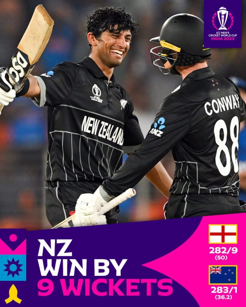 کرکٹ ورلڈ کپ ۲۰۲۳ءمیچ نمبر: ۱ (۵؍ اکتوبر ۲۰۲۳ء)نیوزی لینڈ بمقابلہ انگلینڈ (New Zealand vs England)مقام: نریندر مودی کرکٹ سٹیڈیم احمد آباد، گجرات شائقینِ کرکٹ کے انتظار کی گھڑیاں ختم ہوئیں اور کرکٹ کے عالمی میلے کا آغاز ہوگیا. تیرھویں کرکٹ عالمی کپ (2023 Cricket World Cup) کا افتتاحی میچ دفاعی چیمپئن انگلینڈ اور نیوزی لینڈ کی ٹیموں کے مابین بھارتی ریاست گجرات کے شہر احمد آباد میں کھیلا گیا جس میں نیوزی لینڈ نے انتہائی شاندار کھیل کا مظاہرہ کرتے ہوئے یک طرفہ مقابلہ کے بعد انگلینڈ کی مضبوط ٹیم کو نو وکٹوں سے شکست دے کر گزشتہ ورلڈ کپ کے فائنل میں شکست کا غم کچھ حد تک ہلکا کیا. اس فتح میں اہم کردار کیوی گیند بازوں کےعلاوہ اپنا پہلا ورلڈ کپ میچ کھیلنے والے دو بلے بازوں ڈیون کونوَے (Devon Conway) اور راچِن راوندرا (Rachin Ravindra) نے ادا کیا جنہوں نے نا قابل شکست سنچریاں بنا کر دوسری وکٹ کے لیے273 کی شراکت قائم کی اور یوں نیوزی لینڈ نے 283 رنز کا ہدف صرف 36.2 اوورز میں ایک وکٹ کے نقصان پر پورا کرلیا. کونوَے نے انیس چوکوں اور دو چھکوں کی مدد سے 152 جبکہ راوندرا نے گیارہ چوکوں اور پانچ چھکوں کی مدد سے 123 رنز بنائے. انگلینڈ کی طرف سے واحد وکٹ سَیم کرن نے حاصل کی. میچ کے بہترین کھلاڑی 23 سالہ راچن راوندرا قرار پائے جنہوں نے اپنے کیریئر کی پہلی سینچری سکور کرنے کے علاوہ ایک وکٹ بھی حاصل کی. یہاں ایک دلچسپ امر یہ بھی ہے کہ اس نوجوان کھلاڑی کا نام "راچن" بھارت کے دو مایہ ناز کھلاڑیوں راہول ڈراوڈ (Rahul Dravid) اور سچن ٹنڈولکر (Sachin Tendulkar) کے ناموں سے اخذ کیا گیا ہے. بھارت کے مقامی وقت کے مطابق دوپہر ڈیڑھ بجے نیوزی لینڈ کے قائمقام کپتان ٹام لیتھم نے ٹاس جیت کا پہلے باؤلنگ کرنے کا فیصلہ کیا. کیوی ٹیم اپنے مستقل کپتان کَین وِلیمسن، فاسٹ باؤلرز ٹِم ساؤدی اور لوکی فرگوسن کے بغیر میدان میں اتری. اسی طرح بین سٹوکس انجری کے باعث انگلینڈ کو دستیاب نہ ہوئے. دوپہر دو بجے، احمد آباد کے گرم موسم میں اس ورلڈ کپ کے پہلے میچ کا سنسنی خیز آغاز ہوا جب میچ کی دوسری ہی گیند پر انگلینڈ کے جونی بیرسٹو نے چھکا لگا دیا. کرکٹ ورلڈ کپ کی تاریخ کا یہ پہلا موقع تھا کہ سکورنگ کا آغاز ہی چھکے سے ہوا ہو. ٹرینٹ بولٹ کے پہلے اوور میں 12 رنز بنے جوکہ ان کے کیریئر کا مہنگا ترین پہلا اوور تھا. نیوزی لینڈ باؤلرز کی نپی تلی گیند بازی کی وجہ سے انگلش بلے بازوں کو ابتدا سے ہی اپنا روایتی جارحانہ کھیل پیش کرنے میں دشواری ہوئی اور پہلے دس اوورز میں دو اہم وکٹوں کا نقصان بھی اٹھانا پڑا. اس کے بعد بھی وقفے وقفے سے وکٹیں گرنے کاسلسلہ جاری رہا اور کوئی بھی بڑی شراکت قائم نہ ہوسکی. تاہم سابق انگلش کپتان جو روٹ (Joe Root) نے ذمہ دارانہ بیٹنگ کا مظاہرہ کرتے ہوئے 77 رنز بنائے. ان کے علاوہ کوئی بھی بلے باز نصف سنچری تک نہ پہنچ سکا. ایک غیر معمولی ریکارڈ اس اننگز میں ایک غیر معمولی ریکارڈ یہ بنا کہ ون ڈے کرکٹ کے کُل 4658 میچز کی تاریخ میں پہلی مرتبہ کسی ٹیم کے 11 بلے بازوں نے ڈبل فگرز میں رنز سکور کیے یعنی سب کھلاڑی 10 کا ہندسہ عبور کرنے میں کامیاب رہے. نیوزی لینڈ کی جانب سے مَیٹ ہنری (Matt Henry) نے 10 اوورز میں 48 رنز کے عوض تین وکٹیں حاصل کیں. مچل سَینٹنر(Mitchell Santner) اور گلین فلپس (Glenn Phillips) دو، دو کھلاڑیوں کو آؤٹ کرنے میں کامیاب ہوئے. انگلینڈ نے مقررہ 50 اوورز میں 282 رنز بنائے تھے. افتتاحی مقابلہ میں مجموعی طور پر 565 رنز بنے، جن میں 51 چوکے اور 14 چھکے شامل تھے. ۶؍ اکتوبر کو ٹورنامنٹ کا دوسرا مقابلہ حیدر آباد میں پاکستان (Pakistan) اور نیدر لینڈز (Netherlands) کے مابین کھیلا جائے گا. کہا جا رہا ہے کہ پاکستانی ٹیم حالیہ مقابلوں کے نتائج کے باعث اچھا کھیل پیش کرنے کے لیے یقیناً دباؤ میں ہو سکتی ہے۔ اس کے برعکس ڈچ ٹیم کے لیے اس ورلڈ کپ کے لیے کوالیفائی کرنا اعزاز کی بات ہے اور وہ بغیر کسی خوف اور پریشر کے اس ٹورنامنٹ میں اپنے سفر کا آغاز کریں گے. قبل ازیں ون ڈے کرکٹ ورلڈ کپ میں پاکستان اور نیدرلینڈز کی ٹیمیں 1996ء اور 2003ء میں مدمقابل آچکی ہیں، ان دونوں میچز میں پاکست