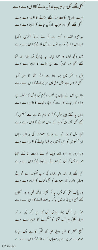 مرے خدایا! حکایتِ دل مجھے سنانے کا اذن دے دے کبھی مجھے بھی درِ حبیبِ خداؐ پہ جانے کا اذن دے دے یہ تیرا لطف و کرم ہے تُو نے زمانۂ آخریں دکھایا اب اس زمانے کو دورِ اوّل سے بھی ملانے کا اذن دے دے میں دیکھ لوں وہ حرا جہاں یہ چراغِ نورِ خدا جلا تھا مجھے بھی نورِ محمدیؐ سے دیا جلانے کا اذن دے دے دل و نظر میں بسا ہوا ہے حریم بطحا کا سبز گنبد کبھی تو اس بے مثال بستی میں سر جھکانے کا اذن دے دے سنا ہے میں نے وہاں پر لطف و کرم کی بارش کا سلسلہ ہے وجود بھر جائے نور سے گر وہاں نہانے کا اذن دے دے وہاں پہ کہتے ہیں حوضِ کوثر کا جام ملتا ہے مَے کشوں کو مجھے بھی تشنہ لبی کو جا کے وہاں مٹانے کا اذن دے دے غبار دل کا بہا کے لے جائے معصیّت کی ہر اک سیاہی ان آنسوؤں کو اس آستاں پر ذرا بہانے کا اذن دے دے وہ سرورِ دو سرا جسے ایک تو نے رحمت بنا کے بھیجا مرے چمن کو اسی کے صدقے سے لہلہانے کا اذن دے دے کیا مجھے مالا مال دنیا جہاں کی سب نعمتوں سے تُو نے وصالِ دلدار کی سعادت کو بھی کمانے کا اذن دے دے وه پاک ہستی کہ جس پہ تُو بھی، ملائکہ بھی درود بھیجیں مجھے بھی اس بارگہ میں جا کر یہ نعت گانے کا اذن دے دے ہؤا ہے جشنِ بہار جاری اسی کا ہے ذکرِ خیر ہر سُو مری مچلتی ہر اک تمنّا کو مسکرانے کا اذن دے دے شفیعِ محشر کا بس وسیلہ ہی مجھ ظفؔر کا ہے اک سہارا جو میرے سر پر ہے بارِ عصیاں اُسے بتانے کا اذن دے دے (مبارک احمد ظفؔر)
