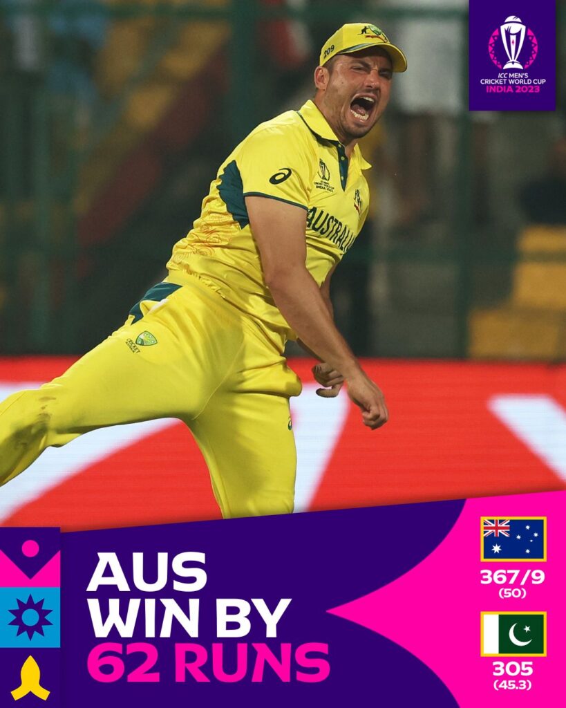 کرکٹ ورلڈ کپ 2023ءمیچ نمبر18: جمعہ20 اکتوبر2023ءپاکستان بمقابلہ آسٹریلیابمقام: بنگلورو(Bengaluru) ڈیوڈ وارنر،مچل مارش اور ایڈم زمپا نے جمعہ 20 اکتوبر کو بنگلورو میں آسٹریلیا کو پاکستان کے خلاف اہم جیت دلائی۔آسٹریلیا نے ابتدائی دو میچوں میں شکست کا سامنا کرنے کے بعدشاندار انداز میں واپسی کرتے ہوئے دوسری لگاتار کامیابی حاصل کی۔جبکہ پاکستان کو پہلے دو میچز جیتنےکے بعددوبڑی ناکامیوں کا سامنا کرنا پڑا اور یوں ورلڈکپ میں ان کا سفرمشکل سے مشکل تر ہوتادکھائی دے رہا ہے۔بنگلوروکے چنا سوامی کرکٹ سٹیڈیم میں پاکستان کے کپتان بابراعظم نے ٹاس جیت کر پہلے آسٹریلیا کو بیٹنگ کی دعوت دی بلےباز کے لئے نہایت سازگارکنڈیشنز اور چھوٹی باؤنڈری والے گراؤنڈ میں آسٹریلوی اوپنرز نے زبردست آغاز فراہم کیا۔مچل مارش نے پہلے ہی اوور میں شاہین آفریدی کو چھکا لگا کر اپنے ارادے واضح کردئیے تھے۔دوسری طرف شاداب خان کی جگہ پاکستانی ٹیم میں شامل ہونے والے اسامہ میرنے شاہین آفریدی کی گیند پر ڈیوڈ وارنرکادس کے سکورپر ایک انتہائی آسان کیچ چھوڑ دیا جوکہ بہت مہنگا ثابت ہوا۔ پہلے آٹھ اوورزمیں آسٹریلیا نے محتاط انداز میں محض 43رنز بنائےلیکن نویں اوور میں حارث رؤف کے پہلے ہی اوور میں 24رنز بنے جس میں چارچوکے اورایک بلند بانگ چھکا شامل تھا۔اس کے بعدDavid WarnerاورMitchell Marsh نے رکنے کا نام نہ لیا۔اور 33.5اوورز میں پہلی وکٹ کی شراکت میں259رنز بناڈالے۔دونوں اوپنرز نے چھکوں اورچوکوں کی خوب بارش کی۔ مچل مارش نے اپنے جنم دن پر121رنز کی شاندار باری کھیلی جس میں نو چھکے اوردس چوکے شامل تھے۔دوسری طرف ڈیوڈ وارنرکا بلا رنز اگلتا رہا اور بالآخراننگز کے 43ویں اوور میں 124گیندوں پر163رنز بنا کر شاہین آفریدی کے ہاتھوں آؤٹ ہوئے۔وارنر کی باری میں نوچھکے اورچودہ چوکے شامل تھے۔ 259رنز پرپہلی وکٹ گرنے کے بعد آسٹریلوی بلے باز اتنے رنز نہ بنا سکے جتنے کی توقع کی جارہی تھی۔آخری دس اوورز میں پاکستانی فاسٹ باؤلرز نے زبردست کم بیک (come back) کیا اور صرف 55رنز کے عوض چھ وکٹیں حاصل کیں۔تاہم آسٹریلیا نے مقررہ پچاس اوورز میں 9وکٹوں کے نقصان پر367کا بڑا سکور ضرور بنا لیا۔پاکستان کی طرف سے شاہین شاہ آفریدی نے پانچ اور حارث رؤف نے تین کھلاڑیوں کو آؤٹ کیا۔ ہدف کے تعاقب میں پاکستانی اوپنرز عبداللہ شفیق (Abdullah Shafiq)اور امام الحق(Imam-ul-Haq) نے بہترین آغاز فراہم کرتے ہوئے 134رنز کی شراکت قائم کی۔لیکن پھر تیز رفتاری سے رنز بنانے کی کوشش میں پاکستان کی وکٹیں گرنا شروع ہوئیں اور کوئی بھی بڑی ساجھے داری نہ بن سکی۔امام الحق نے 70 جبکہ عبداللہ شفیق نے 64رنز بنائے۔بابر اعظم ایک مرتبہ پھرامیدوں کے برعکس جلدی آؤٹ ہوگئے۔محمدرضوان،سعود شکیل اور افتخار احمد نے اچھی بیٹنگ کی لیکن آسٹریلوی گیند باز اہم وقت پر ان کی وکٹیں حاصل کرنے میں کامیاب رہے اور پوری پاکستانی ٹیم 45.3اوورز میں 305رنز بنا کر آؤٹ ہوگئی۔ آسٹریلیا کی جانب سے لیگ اسپنر ایڈم زمپا(Adam Zampa) نے 53رنز دے کر چار اہم وکٹیں حاصل کیں۔Pat Cumminsاور Marcus Stoinisدودوکھلاڑیوں کو آؤٹ کرنے میں کامیاب رہے۔David Warnerکو میچ کا بہترین کھلاڑی قرار دیا گیا۔پوائنٹس ٹیبل پر،اس میچ کے بعد آسٹریلیا چوتھے جبکہ پاکستان پانچویں نمبر پر چلا گیا۔پاکستان کا اگلا میچ 23اکتوبر کو افغانستان کے خلاف چینئی میں ہوگا۔ جبکہ آسٹریلیا کا پانچواں مقابلہ 25اکتوبرکو دہلی میں نیدرلینڈز کے ساتھ ہوگا۔ مختصراسکور: آسٹریلیا 50اوورز میں367/9ڈیوڈوارنر163،مچل مارش 121شاہین آفریدی5/54،حارث رؤف 3/83پاکستان45.3اوورز میں 305/10امام الحق 70،عبداللہ شفیق64،رضوان46ایڈم زمپا4/53،سٹوئنس2/40،کمنز2/62 اہم اعداد و شمار و ریکارڈز • ڈیوڈ وارنر اور مچل مارش کے درمیان 259رنز کی شراکت ODI ورلڈ کپ میں دوسرا سب سے زیادہ اوپننگ سٹینڈ ہے۔ پہلی وکٹ کے لئے سب سے بڑی 282رنز کی شراکت سری لنکا کے تلکارتنے دلشان اور اپل تھرنگا نے 2011 ءمیں زمبابوے کے خلاف بنائی تھی۔• آسٹریلیا کے9 وکٹ پر 367 رنز،ورلڈ کپ میں پاکستان کے خلاف کسی بھی ٹیم کا سب سے بڑاسکور ہے۔اسی ط