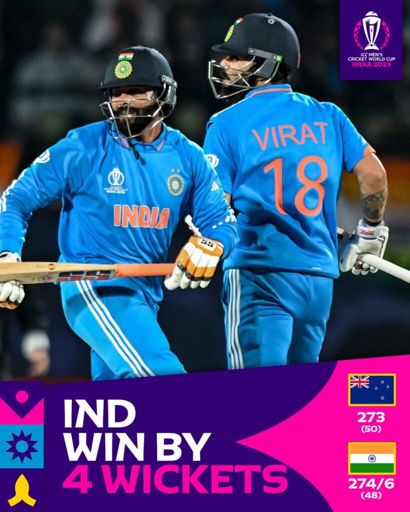 کرکٹ ورلڈ کپ 2023ء میچ نمبر21: اتوار،22 اکتوبر2023ء بھارت بمقابلہ نیوزیلینڈ بمقام: دھرم شالا (Dharamsala) ۲۲اکتوبرکو دھرم شالا کے میدان میں ہونے والے اہم میچ میں محمد شامی (Mohammed Shami) کی پانچ وکٹوں اور ویرات کوہلی (Virat Kohli)کے 95رنز کی بدولت بھارت نے نیوزیلینڈکوچاروکٹوں سے شکست دے کر اپنی فتوحات کا سلسلہ برقراررکھا۔پانچ میں سے پانچ مقابلے جیت کر میزبان ٹیم پوائنٹس ٹیبل پر پہلے نمبرپر براجمان ہوگئی ۔ انڈین کیپٹن روہت شرما نے ٹاس جیت کر ایک مرتبہ پھر باؤلنگ کرنے کا فیصلہ کیا۔جسے ان کے فاسٹ باؤلرزنے آغاز میں ہی درست ثابت کردیا۔کیوی اوپنرDevon Conwayبغیرکوئی رن بنائے آؤٹ ہوئے اور پھر19کے مجموعی سکورپرWill Young بھی محمد شامی کی اس ورلڈ کپ میں پہلی گیند پر اپنی وکٹ گنوا بیٹھے۔تیسری وکٹ کی شراکت میں Rachin Ravindraاور Daryl Mitchellنے شاندار159رنز کا اضافہ کیا۔75کے انفرادی سکورپرRavindra آؤٹ ہوئے لیکن دوسری طرف Mitchell نے بہترین سینچری بنائی۔وہ اپنے کیرئیر کا سب سے زیادہ سکور130بناکر آؤٹ ہوئے۔آخری اوورز میں انڈین باؤلرز نے زبردست کم بیک کیا اورآخری 13اوورز میں محض 68رنز کا اضافہ ہوسکا۔نیوزیلینڈ کی آخری چھ وکٹیں صرف 30رنز کے اضافہ پر گریں۔اور یوں مقررہ پچاس اوورز میں کیوی ٹیم درمیانے درجہ کے سکور273پرآل آؤٹ ہوگئی۔ بھارت کی طرف سے سب سے کامیاب باؤلرMohammed Shamiرہے جوکہ اس ورلڈ کپ میں اپنا پہلا میچ کھیل رہے تھے ۔انہوں نے 54 رنز کے عوض پانچ وکٹیں حاصل کیں۔Kuldeep Yadavآج کے میچ میں مہنگے ثابت ہوئے لیکن وہ دو اہم کھلاڑیوں کو آؤٹ کرنے میں ضرور کامیاب رہے۔BumrahاورSiraj نے ایک ایک وکٹ حاصل کی۔ 274کے ہدف کے تعاقب میں بھارتی اوپنرز نے ایک بار پھر دھواں دار آغاز کیا۔خاص طورپر کپتان روہت شرما نے جارحانہ بیٹنگ کی اور چارچوکوں اور چارچھکوں کی مدد سے 46 رنز بنا کر اپنی ٹیم کے لئے زبردست شروعات کیں۔Shubman Gill بھی اچھی فارم میں دکھائی دئیے تاہم صرف26 رنز بناکر آؤٹ ہوگئے۔ابتدائی دونوں کھلاڑیوں کو نیوزیلینڈ کے تیز ترین گیند باز Lockie Ferguson نے آؤٹ کیا۔بھارت کے مڈل آرڈر بلے باز Shreyas IyerاورKL Rahul لمبی باری کھیلنے میں ناکام رہے اور بالترتیب 33اور27کے سکور پر واپس لوٹ گئے۔لیکن دوسری جانب Virat Kohliنے ایک مرتبہ پھر ثابت کیا کہ وہ کس پایہ کے بلے باز ہیں ۔انہوں نے میچ کو کسی بھی وقت اپنی ٹیم کی گرفت سے دورنہ جانے دیا۔ Suryakumar Yadav جو ورلڈ کپ میں اپنا پہلامیچ کھیل رہے تھے ،بدقسمتی سے صرف دوکے سکورپر رن آؤٹ ہوگئے۔اس کےبعدچھٹی وکٹ کی ساجھے داری میں Kohli اور Jadejaنے 78 رنز کا اضافہ کیا۔ویرات کوہلی اپنے ون ڈے کیرئیر کی انچاسویں سینچری سے محض پانچ رنز کی دُوری پر آؤٹ ہوئے تو بھارت کو جیت کے لئے بھی پانچ رنز ہی درکار تھے۔Ravindra Jadejaنے ناقابل شکست 39 رنز کی اہم اننگز کھیلی اور انڈیا نے ہدف6وکٹوں کے نقصان پر48اوورز میں پورا کرلیا۔محمدشامی کو شاندارکارکردگی پر پلیئرآف دی میچ کا ایوارڈ دیا گیا۔ نیوزیلینڈ کی طرف سے لوکی فرگوسن نے دو جبکہ ٹرینٹ بولٹ،میٹ ہنری اورمچل سینٹنر نے ایک ایک وکٹ حاصل کی۔اس جیت کے بعدمیزبان ٹیم کی سیمی فائنل میں جانے کی راہ ہموار ہو چکی ہے۔بھارت کے لئے آئندہ چار میچوں نے صرف ایک کامیابی بھی یقینی طورپرورلڈ کپ کی ٹاپ چار ٹیموں جگہ بنانے کے لئے کافی ہوگی۔ مختصر اسکور: نیوزی لینڈ 50 اوورز میں /10273 ڈیرل مچل 130،راچن رویندرا 75؛ محمد شامی 5/54،کلدیپ یادیو 2/73 بھارت 48اوورز میں 274/6 ویرات کوہلی95،روہت شرما 46،جادیجا39* لوکی فرگوسن2/63،مچل سینٹنر1/37 اہم اعدادوشمار و ریکارڈز بھارت کے نوجوان بلے باز شبمن گل (Shubman Gill) نے ون ڈے کیریئر میں تیز ترین2000رنز مکمل کر لئے۔انہوں نے یہ سنگ میل صرف38 اننگز میں عبورکیا۔اس سے قبل یہ ریکارڈ جنوبی افریقہ کے ہاشم آملہ (Hashim Amla)کے پاس تھا جنہوں نے 40اننگز میں دوہزار رنز بنائے تھے۔ون ڈے انٹرنیشنل میں مجموعی طورپر سب سے زیادہ رنز بنانے والے کھلاڑیوں کی فہرست میں بھارتی بلےبازویرات کوہلی 13437 رنز کے ساتھ چوتھے نمبر پر آگئے۔ اس فہرست میں 18426رنز بنا کر سچن ٹنڈولکرسب سے آگے ہیں۔سری لنکا کے کمار