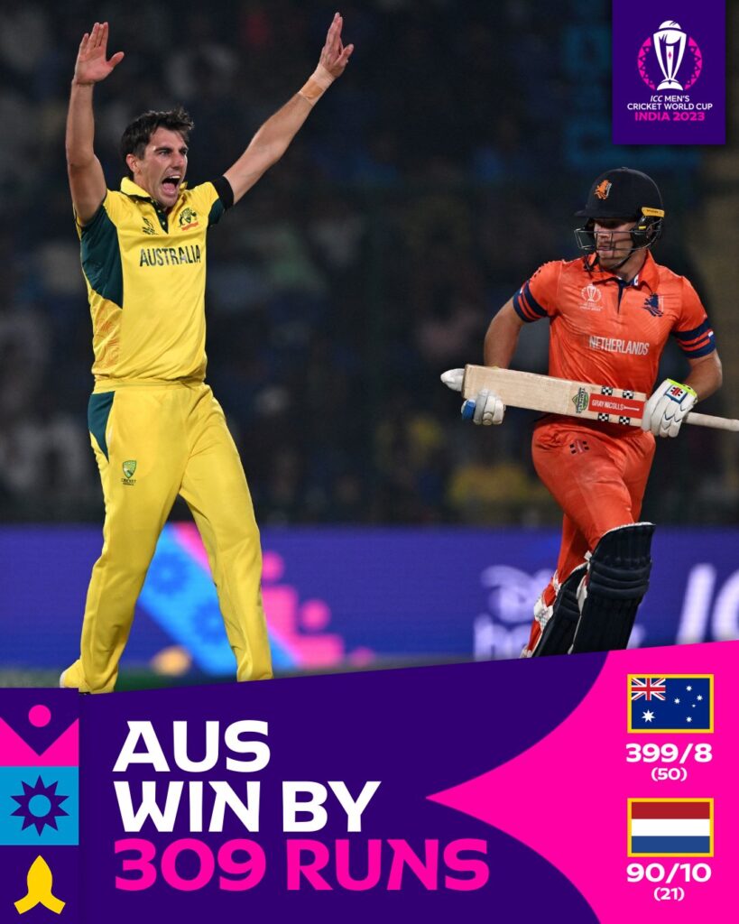 کرکٹ ورلڈ کپمیچ نمبر24: بدھ 25 اکتوبر2023ءآسٹریلیا بمقابلہ نیدرلینڈزبمقام: دہلی (Delhi) دہلی کے ارون جیٹلی سٹیڈیم میں نیدرلینڈز کے خلاف گلین میکسویل (Glenn Maxwell) نے ورلڈ کپ میں تیز ترین سینچری بنانےکا ریکارڈ اپنے نام کیا۔ڈیوڈ وارنر(David Warner) نے لگاتاردوسری سینچری بنائی اورآسٹریلیا نے309رنزکے بڑے فرق سے کرکٹ ورلڈکپ کی تاریخ میں رنز کے اعتبارسے سب سے بڑی کامیابی حاصل کی۔بیٹنگ کے لئے نہایت سازگاراورسپاٹ pitchپرآسٹریلیا نے ٹاس جیت کر پہلےبلے بازی کی اور نیدرلینڈز کے خلاف مقررہ پچاس اوورز میں آٹھ وکٹ کے نقصان پر399رنز کا پہاڑکھڑا کردیا۔ جواب میں ڈچ ٹیم محض 90رنز پرڈھیرہوگئی۔ اس میچ میں آسٹریلوی اوپنرمچل مارش جلد آؤٹ ہوئے لیکن ڈیوڈ وارنرنے اسٹیون سمتھ (Steven Smith)کے ساتھ دوسری وکٹ کی شراکت میں 132رنز بنائے۔Smithنے 71رنز بنائے دوسری طرف Warnerنے ایک بارپھر شاندار سینچری مکمل کی،وہ93گیندوں پر104رنز بناکرآؤٹ ہوئے جس میں 11چوکے اور3چھکے شامل تھے۔چوتھے نمبرپر بلے بازی کرنے والے مارنس لیبوشین (Marnus Labuschagne)نے 47بالز پر62 رنز کی اننگز کھیلی۔چالیس اوورز کے اختتام پر آسٹریلیا کا سکور5وکٹوں کے نقصان پر268رنز تھا۔ اس وقت بیٹنگ کرنے آئے گلین میکسویل اور انہوں نےدھواں دار بلے بازی کرتے ہوئے چوکوں چھکوں کی برسات کردی۔27گیندوں پر نصف سینچری مکمل کرنے کے بعد اگلی 13بالز پر میکسویل 100کے ہندسہ کو عبورکرنے میں کامیاب ہوئے اور یوں 40گیندوں پر ون ڈے کرکٹ ورلڈ کپ کی تاریخ میں تیز ترین سینچری بناڈالی۔قبل ازیں اسی میدان پر سری لنکا کے خلاف جنوبی افریقہ کے ایڈن مارکرم نے 49گیندوں پر تیز ترین سینچری کا ریکارڈبنایا تھا۔ نیدرلینڈز کی طرف سے کامیاب ترین گیند بازLogan van Beekرہےجنہوں نے 74دے کرچارکھلاڑیوں کو آؤٹ کیا۔Bas de Leedeنے 115 رنزکے عوض دو وکٹیں حاصل کیں۔ 399رنز کے جواب میں ڈچ بیٹنگ بری طرح ناکام رہی ۔اورپوری ٹیم 21اوورز میں صرف 90کے مجموعی سکورپرآؤٹ ہوگئی اوپنرVikramjit Singhنے سب سے زیادہ 25رنز بنائے۔آسٹریلیا کی طرف سے مسلسل تیسرے میچ میں لیگ اسپنرAdam Zampaنے چارکھلاڑیوں کوآؤٹ کیا۔ابھی تکZampaتیرہ وکٹوں کے ساتھ اس ٹورنامنٹ کے کامیاب ترین باؤلر ہیں۔مچل مارش نے دو جبکہ سٹارک ،ہیلزوُڈ اور کمنز نے ایک ایک وکٹ حاصل کی ۔ آسٹریلوی ٹیم ابتدائی دومیچز ہارنے کے بعدلگاتارتین کامیابیاں سمیٹ چکی ہے اور پوائنٹس ٹیبل پر چوتھے نمبر پر ہے۔اس میچ میں بڑے مارجن سے فتح کی بدولت آسٹریلیا کا نیٹ رن ریٹ بھی بہت بہتر ہوگیا ہے۔ آسٹریلیا کا اگلا اہم مقابلہ نیوزی لینڈ کے ساتھ 27اکتوبرکو دھرم شالا میں ہوگا جبکہ اسی روز نیدرلینڈز کا میچ بنگلہ دیش کے ساتھ کولکتہ (Kolkata)میں کھیلا جائے گا۔ خلاصہ:آسٹریلیا 8 وکٹوں پر399 رنز،50اوورزگلین میکسویل 106،ڈیوڈوارنر104،لیبوشین 62لوگن فان بیک 74/4،باس ڈی لیڈے 115/2نیدرلینڈز 21اوورز میں 90رنز بنا کرآل آؤٹوکرم جیت سنگھ25،ایڈم زمپا8/4،مچل مارش 19/2 آسٹریلیا نے 309رنزسے کامیابی حاصل کی۔گلین میکسویل(Gleen Maxwell) میچ کے بہترین کھلاڑی قرارپائے۔ اہم اعداد و شمار و ریکارڈز • 40گیندوں پر گلین میکسویل کی سینچری ورلڈ کپ میچز میں تیز ترین جبکہ ایک روزہ مقابلوں میں چوتھی تیز ترین سینچری ہے۔ایک روزہ کرکٹ میں تیز ترین سینچری بنانے کا ریکارڈ جنوبی افریقہ کے AB de Villiers کے پاس ہے جنہوں نے 2015ء میں ویسٹ انڈیز کے خلاف جوہانسبرگ میں 31گیندوں پر یہ سنگ میل عبورکیا تھا۔ • ڈیوڈوارنر نےورلڈ کپ مقابلوں میں اپنی چھٹی سینچری سکورکی۔وہ آسٹریلیا کی طرف سے ورلڈ کپ میں سب سے زیادہ سینچریاں بنانے والے بلےبازبن گئے۔رکی پونٹنگ نے پانچ سینچریاں بنائی تھیں۔ • نیدرلینڈزکے خلاف 399رنز کا مجموعی سکور آسٹریلیا کا ورلڈکپ مقابلوں میں دوسرابڑا مجموعہ ہے۔2015ء میں آسٹریلوی ٹیم نے افغانستان کے خلاف 417رنز بنائے تھے۔ • ڈچ گیندباز باس ڈی لیڈے نے 10اوورز میں 115رنز دئیے اور یوں ایک روزہ میچز کی تاریخ میں مہنگے ترین باؤلر بن گئے۔ • 309رنز کے فرق سے آسٹریلیا کی کامیابی ورلڈ کپ میں سب سے بڑی فتح ہے ،جبکہ رنز کے لحاظ سے ون ڈے کرکٹ 