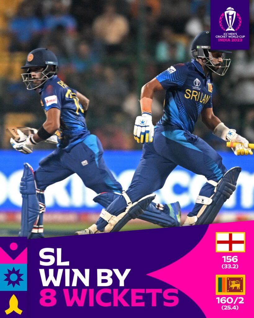 کرکٹ ورلڈ کپمیچ نمبر25: جمعرات 26 اکتوبر2023ءانگلینڈ بمقابلہ سری لنکابمقام: بنگلورو(Bengaluru) بھارت کی جنوبی ریاست کرناٹکا کے صدرمقام بنگلوروکے چناسوامی اسٹیڈیم میں کرکٹ ورلڈ کپ۲۰۲۳ء کے پچیسوَیں مقابلہ میں سری لنکا نے دفاعی چیمپئن انگلستان کو آٹھ وکٹو ں سے زَیرکردیا۔اس ٹورنامنٹ میں انگلش ٹیم کی پانچ میچوں میں چوتھی ہار کے ساتھ سیمی فائنل تک رسائی اور اپنے ٹائٹل کے کامیاب دفاع کی امیدیں ٹوٹنے لگی ہیں۔ اس میچ میں انگلش ٹیم میں تین تبدیلیاں کی گئیں۔معین علی،لیام لیوِنگسٹن(Liam Livingstone) اور کرس ووکس (Chris Woakes)کوٹیم میں شامل کیا گیا۔جبکہ گزشتہ میچ میں زخمی ہونے والے رِیس ٹاپلی (Reece Topley)ٹورنامنٹ سے باہر ہوچکے ہیں۔سری لنکن سکواڈ میں Pathiranaکی جگہ شامل ہونے والے تجربہ کار کھلاڑی اورسابق کپتان اینجلومیتھیوز(Angelo Mathews)نےاس میچ میں شرکت کی۔اسی طرح فاسٹ باؤلر Lahiru Kumaraبھی سری لنکا کی پلیئنگ الیون میں جگہ بنانے میں کامیاب ہوئے۔ انگلش کیپٹن Jos Butlerنے ٹاس جیت کر پہلے بیٹنگ کرنے کا فیصلہ کیا جسے اوپنرز نے پہلے چھ اوورز میں ۴۴رنز بناکر درست ثابت کیا ۔کنڈیشنزکو مدنظررکھتے ہوئے توقع کی جارہی تھی کہ اس میچ میں انگلینڈ ٹیم بڑا سکوربنانے میں کامیاب ہوگی ۔ لیکن جیسے ہی سری لنکا نے اینجلو میتھیوزکو باؤلنگ کے لئے گیندتھمائی جو میچ کا پانسہ پلٹنے لگا۔Mathewsنے تین سال بعد ون ڈے انٹرنیشنل میچ میں گیندبازی کرتے ہوئے اپنی تیسری ہی بال پر Dawid Malanکی اہم وکٹ حاصل کرلی۔پھر چند اوورز بعد Mathewsکے ہاتھوں Joe Rootرن آؤٹ ہوگئے۔اس کےبعدانگلینڈ کےبلے بازیکے بعددیگرے اپنی وکٹیں گنوانے لگے اور کوئی بھی بیٹسمین جم کر نہ کھیل سکا۔سری لنکا کے آف اسپنرMaheesh Theekshananaنے اپنی نپی تلی گیندبازی سے بلے بازوں کو دباؤمیں ڈالا اوردوسری طرف سے فاسٹ باؤلرLahiru Kumaraنے تین اہم کھلاڑیوں کو آؤٹ کرکے انگلش بیٹنگ لائن کی کمرتوڑدی۔ Ben Stokesنے سب سے زیادہ 43رنزبنائے ۔ پوری انگلش ٹیم 33.2اوورزمیں156رنز بنا کرآؤٹ ہوگئی۔ سری لنکا کی طرف سے Lahiru Kumara نے تین کھلاڑیوں کو آؤٹ کیا۔Kasun Rajithaاور Angelo Mathewsکے حصہ میں دو،دووکٹیں آئیں۔ ہدف کے تعاقب میں سری لنکا کا آغاز اچھا نہ تھا،23کے سکور پر Kusal PareraاورKusal Mendisآؤٹ ہوکر واپس لوٹ گئے۔ان دونوں بلے بازوں کو David Willeyنے شکارکیا۔لیکن اس کے بعداِن فارم بلےباز Pathum Nissanka اور Sadeera Samarawickrama کے درمیان 137رنز کی ناقابل شکست ساجھے داری قائم ہوئی ۔ Nissanka نے اس ٹورنامنٹ میں اپنی لگاتارچوتھی نصف سینچری بنائی ۔انہوں نے دوچھکوں اورسات چوکوں کی مددسے ناٹ آؤٹ 77رنز کی بہترین باری کھیلی۔جبکہ Samarawickrama نے 65رنزصرف 54گیندیں کھیل کر بنائے جن میں ایک چھکا اور سات چوکے شامل تھے۔ یوں سر ی لنکن ٹیم نے مطلوبہ ٹارگٹ دو وکٹوں کے نقصان پر25.4اوورز میں پورا کرلیا۔ اس جیت کے بعد سری لنکا پانچ میچز میں چار پوائنٹس کے ساتھ پانچویں نمبر پر آگیا۔ان کا اگلا مقابلہ 30اکتوبرکو افغانستان کے خلاف پونے (Pune)میں ہوگا۔جبکہ انگلینڈ کواپنے چھٹے میچ میں لکھنؤ کے میدان پرمیزبان بھارت کے کڑے امتحان کا سامنا ہو گا۔سر ی لنکاسے مایوس کن شکست کھانے کے بعد انگلینڈ کے کپتان جوس بٹلر(Jos Butler)نے کہا کہ ہم بحیثیت ٹیم اپنے بہترین کھیل سے بہت دور ہیں اور یہ ہمارے لئے بہت کٹھن وقت ہے۔انہوں نے اعتراف کیا کہ گیند اوربَلے دونوں کے ساتھ ان کی کارکردگی معیار سے بہت نیچے رہے۔تاہم بٹلر نے اس عزم کااظہار کیا کہ آئندہ مقابلوں میں انگلینڈٹیم بہتر کھیل پیش کرے گی۔ خلاصہ: انگلینڈ33.2اوورز میں 156رنز پر آل آؤٹبین اسٹوکس43،بیئرسٹو30لاہیروکمارا3/35،میتھیوز2/14سری لنکا 25.4اوورز میں 2وکٹوں کے نقصان پر160رنزنسانکا77،سمراوکراما65سری لنکا کے لاہیروکمارا کو میچ کا بہترین کھلاڑی قرار دیا گیا۔ اہم اعداد و شمار و ریکارڈز • ورلڈ کپ 1996ء کے بعد پہلی بار انگلینڈکو عالمی ٹورنامنٹ مسلسل تین میچز میں ناکامی کا سامنا کرنا پڑا ہے۔ • ورلڈ کپ 2007ءسے اب تک لگاتار پانچویں بار سری لنکا نے انگلینڈ کو شکست سے دوچار کیا ہے۔ • سری لنکا کے پاتھم نسانکا نے رواں برس گیا