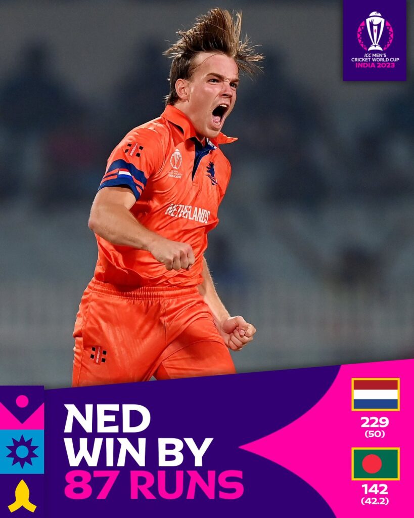 کرکٹ ورلڈ کپمیچ نمبر28: ہفتہ 28 اکتوبر2023ءبنگلہ دیش بمقابلہ نیدرلینڈزبمقام: کولکتہ (Kolkata) نیدرلینڈز نے بنگلہ دیش کو کولکتہ کے میدان پر87رنز سے شکست دے کر اس ورلڈ کپ میں اپنی دوسری فتح حاصل کی۔230رنز کے تعاقب میں بنگلہ دیشی ٹیم محض 142کےسکورپر ڈھیرہوگئی۔نیدرلینڈز کے کپتان سکاٹ ایڈورڈز(Scott Edwards) نےبلے بازی اور پال وین میکرین(Paul van Meekeren)نے گیندبازی میں شاندارکارکردگی دکھائی۔ بھارت کی ریاست مغربی بنگال کے دارالحکومت کولکتہ(Kolkata) جسے ماضی میں کلکتہ (Calcutta) کہا جاتا تھا،کے ایڈن گارڈنزکرکٹ اسٹیڈیم میں اس ورلڈ کپ کا پہلا میچ کھیلا گیا۔ نیدرلینڈز نے ٹاس جیت کربیٹنگ کا فیصلہ کیا تو اس کے اوپنرز4کے مجموعی سکورپر واپس لوٹ گئے۔بنگلہ دیش کے فاسٹ باؤلرز نے اچھا آغاز کیا اور پہلے دس اوورز صرف 47رنز بن سکے ۔ نیدرلینڈز کی طرف سے 2011ء کے ورلڈ کپ میں نمائندگی کرنے والے ویسلے بریسی(Wesley Barresi) نے اس ٹورنامنٹ میں اپنا پہلا میچ کھیلتے ہوئے 41رنز کی اچھی اننگز کھیلی جس میں 8چوکے شامل تھے۔63کے مجموعی سکور پر ڈچ ٹیم کی تیسری اور چوتھی وکٹ بھی گر گئی جس کے بعدسکاٹ ایڈورڈز کےصفر کے سکور پریکے بعد دیگرے دوکیچ چھوٹ گئے جوبعدازاں بہت مہنگے ثابت ہوئے۔سکاٹ ایڈورڈزنے باس ڈی لیڈے کے ساتھ مل کر سکورکو 100تک پہنچایا لیکن 17کے انفرادی سکور پر Bas de Leedeبھی آؤٹ ہوگئے۔ چھٹی وکٹ کی شراکت میں Scott EdwardsاورSybrand Englebrechtنے اہم 78رنز جوڑے۔کپتان ایڈورڈز نے ایک مرتبہ پھر ذمہ دارانہ بلے بازی کرتے ہوئےورلڈکپ میں اپنی دوسری نصف سینچری بنائی۔یہ دونوں بلے باز 185کے سکور پر آؤٹ ہوگئے ۔تاہم آخری 4اوورز میں ڈچ ٹیم 40رنز کا اضافہ کرنے میں کامیاب رہی ۔اوریوں مقررہ پچاس اوورز میں 229رنز بناکرآؤٹ ہوگئی ۔ بنگلہ دیش کی جانب سے مستفیض الرحمٰن ،تسکین احمد،شریف الاسلام اور مہدی حسن نے دو،دووکٹیں حاصل کیں۔ توقع کی جارہی تھی کہ 230کا ہدف بنگلہ دیشی ٹیم آسانی سے پورا کر لے گی لیکن نیدرلینڈز نے ایک بارپھر سب کو حیرا ن کردیا۔ڈچ باؤلرز نے بہترین باؤلنگ کا مظاہرہ کیا،پچ سے بھی انہیں مدد ملی اور بنگلہ دیش کے بلے بازوں نےبھی غیرذمہ دارانہ بیٹنگ کے ساتھ حریف ٹیم کو اپنے اوپرحاوی ہونے کا موقع دیا۔نتیجۃً بنگلہ دیش کی طرف سےکوئی بھی کھلاڑی جم کر نہ کھیل سکا اور وقفے وقفے سے وکٹیں گرنے کاسلسلہ جاری رہا۔اور پوری ٹیم 42.2اوورز میں 142رنز بنا کر آؤٹ ہوگئی۔ مہدی حسن میراز35رنز بنا کر ٹاپ سکورر رہے۔نیدرلینڈز کی طرف سے تیز گیندباز پال وین میکرین (Paul van Meekeren)نے صرف 23رنز کے عوض چارکھلاڑیوں کو آؤٹ کیا۔باس ڈی لیڈے نے دو جبکہ آریان دت،کولن ایکرمن اور لوگن وَین بیک نے ایک ایک وکٹ حاصل کی۔ خلاصہ:نیدرلینڈز 50اوورز میں 229رنز پر آل آؤٹسکاٹ ایڈورڈز68،ویسلے بریسی41،اینگل بریٹ35مستفیض الرحمٰن 36/2،مہدی حسن 40/2بنگلہ دیش42.2اوورز میں 142رنزپرآل آؤٹمہدی حسن میراز35،محموداللہ20،مستفیض 20پال وین میکرین 23/4،باس ڈی لیڈے 25/2 نیدرلینڈز کے پال وین میکرین (Paul van Meekeren) میچ کے بہترین کھلاڑی قرارپائے۔ اہم اعدادوشماروریکارڈز • اس میچ میں پال وین میکرین کی 23رنز کے عوض چار وکٹین ورلڈکپ میچز میں کسی بھی ڈچ باؤلر کی بہترین کارکردگی ہے۔اس سے قبل 2003ء کے ورلڈ کپ میں ٹم ڈی لیڈے نے انڈیا کے خلاف 35رنز دے کرچارکھلاڑیوں کو آؤٹ کیا تھا۔• نیدرلینڈز کی بنگلہ دیش کے خلاف 87رنز سے کامیابی ورلڈ کپ مقابلوں میں کسی ایسوسی ایٹ ٹیم کی ٹیسٹ کھیلنے والی ٹیم کے خلاف سب سے بڑی فتح ہے۔• ورلڈ کپ مقابلوں میں بنگلہ دیش کی ایسوسی ایٹ ٹیموں کے خلاف یہ چوتھی ہار ہے۔قبل ازیں 2003ء میں کینیا اور کینیڈا جبکہ 2007ء میں آئرلینڈ کے ہاتھوں بنگلہ دیش کو شکست کا سامنا کرنا پڑاتھا۔ (رپورٹ: ۔ن م طاہر)