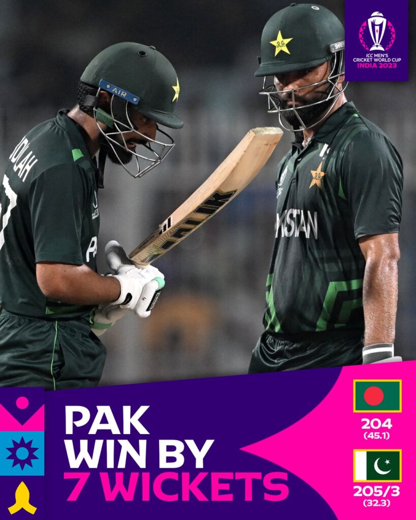 کرکٹ ورلڈ کپ میچ نمبر31: منگل31 اکتوبر2023ء پاکستان بمقابلہ بنگلہ دیش بمقام: کولکتہ (Kolkata) آئی سی سی کرکٹ ورلڈکپ کے 31وَیں میچ میں پاکستان نے بنگلہ دیش کو یکطرفہ مقابلہ کے بعدسات وکٹوں سے شکست دے کر سیمی فائنل میں پہنچنے کی امید کوبرقرار رکھا جبکہ بنگلہ دیش سات میں سے چھ میچز ہارکرٹورنامنٹ سے باہر ہونے والی پہلی ٹیم بن گئی۔ کولکتہ کے ایڈن گارڈنز میں کھیلے گئے میچ میں بنگلہ دیش کے کپتان ثاقب الحسن نے ٹاس جیت کر پہلے بیٹنگ کرنے کا فیصلہ کیاتو بنگلہ دیش کی پوری ٹیم 46 ویں اوور میں 204 رنز بناکر آؤٹ ہوگئی ۔محمود اللہ 56 رنز بناکر نمایاں رہے۔پاکستان نے مطلوبہ ہدف بآسانی 33 ویں اوور میں 3 وکٹوں کے نقصان پر پورا کرلیا،فخر زمان نے شاندار 81 رنز بنائے۔ بنگلہ دیش کے خلاف جیت پاکستان ٹیم کی رواں ورلڈکپ میں تیسری کامیابی ہے جبکہ اس شکست کے بعد بنگلہ دیش سیمی فائنل کی دوڑ سے باہر ہوچکا ہے۔پاکستان کو سیمی فائنل میں پہنچنے کیلئے نہ صرف اپنے بقیہ 2 میچز نیوزیلینڈ اور انگلینڈ کے خلاف بڑے مارجن سے جیتنے پڑیں گے بلکہ دوسری ٹیموں کے میچز کے نتائج پر بھی انحصار کرنا ہوگا۔ اس میچ میں پاکستانی ٹیم میں تین تبدیلیاں کی گئیں۔امام الحق کی جگہ فخر زمان کی واپس ہوئی جبکہ محمد نواز کی جگہ سلمان علی آغا اور شاداب خان کی جگہ اسامہ میر کو پلیئنگ الیون میں شامل کیا گیا۔بنگلہ دیش کی ٹیم میں ایک تبدیلی ہوئی،مہدی حسن کی جگہ توحید کو شامل کیا گیا۔ بنگلہ دیش کی اننگز کا آغاز بالکل اچھا نہ تھا،اوپنر تنزید حسن (Tanzid Hasan) کو شاہین نے پہلے ہی اوور میں صفر پر آؤٹ کردیا۔اس کے بعد نجم الحسین شانتو کو بھی شاہین آفریدی نے 4کے سکورپرآؤٹ کیا، اسامہ میر نے ایک اچھا کیچ پکڑا۔پھر حارث رؤف نے اپنے پہلے اوور میں مشفیق الرحیم کی اہم وکٹ حاصل کی تو بنگلہ دیش کا مجموعی سکور3کھلاڑیوں کے نقصان پر23رنز تھا۔چوتھی وکٹ کی شراکت میں لٹن داس (Litton Das)اورمحموداللہ(ٍMahmudullah) میں 79رنز بنائے۔لٹن داس افتخار احمد کی گیند پر کیچ آؤٹ ہوئے تو اس کے بعد کوئی بھی بلے باز جم کر نہ کھیل سکا اور یکے بعد دیگر بنگلہ دیش کی وکٹیں گرتی رہیں۔ پاکستانی فاسٹ باؤلرز شاہین شاہ آفریدی اور محمد وسیم جونیئر نے بہترین کارکردگی کا مظاہرہ کرتے ہوئے تین تین کھلاڑیوں کو آؤٹ کیا۔جبکہ حارث رؤف نے دووکٹیں حاصل کیں۔آف اسپنر افتخار احمد نے بھی اچھی باؤلنگ کی اور 10اوورز میں 44رنز کے عوض ایک اہم وکٹ حاصل کی۔اسامہ میر خاطرخواہ پرفارمنس دینے میں ناکام رہے ،ان کے 10اوورز میں 66رنز بنے اور ایک کھلاڑی آؤٹ ہوا۔ بنگلہ دیش کی جانب سے محموداللہ نے ایک بار پھر ذمہ دارانہ بلے بازی کی اور نصف سینچری بنانے میں کامیاب رہے۔کپتان ثاقب الحسن نے43 اور مہدی حسن میراز نے 25رنز کی باری کھیلی۔بنگلہ دیش کی ٹیم 45.1 اوور میں 204 رنز بناکر آؤٹ ہوئی۔ 205 رنز کے تعاقب میں پاکستانی اوپنرز نے شاندار آغازکیا۔عبداللہ شفیق اور فخر زمان کےدرمیان 21اوورز میں 128 رنز کی شراکت قائم ہوئی۔عبداللہ شفیق69 گیندوں پر 68 رنز بناکر آؤٹ ہوئے جس میں دو چھکے اور9چوکے شامل تھے۔کپتان بابر اعظم 16گیندوں پر صرف 9رنز بنا سکے ۔ بائیں ہاتھ کے جارح مزاج بلے بازفخر زمان لمبے عرصے بعد اچھی فارم میں نظرآئے۔وہ 74 گیندوں پر 81 رنز کی دھواں دار اننگز کھیلنے میں کامیاب رہے۔ان کی باری میں 7 بلند وبالاچھکے اور 3 چوکے شامل تھے۔محمد رضوان کے 26 اور افتخار احمدکے 17 رنز کی بدولت پاکستان نے ہدف 32.3 اوورز میں پورا کرلیا۔فخر زمان کو میچ کا بہترین کھلاڑی قراردیا گیا۔بنگلہ دیش کی طرف سے تینوں وکٹیں مہدی حسن میراز کے حصہ میں آئیں۔ پاکستان کا اگلا میچ 4نومبرکو بنگلورو میں نیوزیلینڈ کے خلاف ہوگا جبکہ بنگلہ دیش کا مقابلہ سری لنکا کے ساتھ 6نومبر کو دہلی کے میدان پر ہوگا۔ خلاصہ بنگلہ دیش45.1 اوورزمیں 204 رنز پر آل آؤٹ محمود اللہ56،لٹن داس 45؛ شاہین آفریدی 23/3،محمد وسیم جونیئر 31/3 پاکستان 32.3 اوورز میں 205/3رنز فخرزمان 81،عبداللہ شفیق 68؛ مہدی حسن میراز60/3 اہم ریکارڈز واعدادوشمار شاہین شاہ آفریدی ایک روزہ انٹر