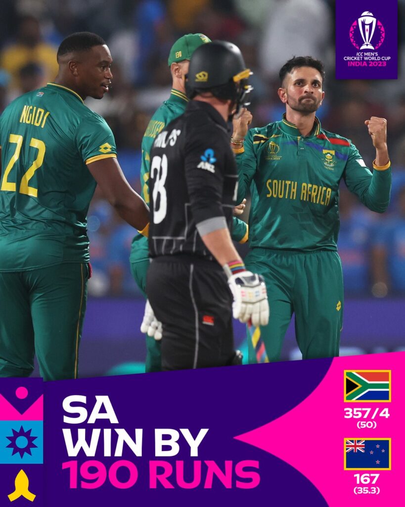 کرکٹ ورلڈ کپ میچ نمبر32: بدھ یکم نومبر2023ء نیوزیلینڈ بمقابلہ جنوبی افریقہ بمقام: پونے (Pune) جنوبی افریقہ نے رواں ورلڈ کپ میں اپنا شاندار سفر جاری رکھتے ہوئے نیوزیلنڈ کو 190رنز کے بڑے مارجن سے شکست دے کر پوائنٹس ٹیبل پر پہلی پوزیشن حاصل کرنے کے ساتھ ساتھ سیمی فائنل میں رسائی یقینی بنا لی۔ کوئنٹن ڈی کاک (Quinton de Kock) اور راسی وان ڈر ڈوسن(Rassie van der Dussen) کی سینچریوں کی بدولت جنوبی افریقہ نے نیوزیلینڈ کے خلاف 357کا بڑامجموعہ کھڑا کیا۔یہ لگاتار آٹھواں موقع ہےکہ جنوبی افریقہ نے ون ڈے کرکٹ میں پہلے بیٹنگ کرتے ہوئے 300 رنز کا ہندسہ عبور کیا۔جواب میں کیوی ٹیم صرف 167 کے سکورپرڈھیرہوگئی۔ کیوی کیپٹن ٹام لیتھم (Tom Latham)نے ٹاس جیت کر باؤلنگ کرنے کا فیصلہ کیاتو نئی گیند کے ساتھ ٹرینٹ بولٹ (Trent Boult)نے بہترین باؤلنگ کرتےہوئےپروٹیز کیپٹن ٹیمبا بووما(Temba Bavuma) کی وکٹ حاصل کی۔ Bavumaنے ایک چھکے اورچارچوکوں کی مدد سے 28رنز بنائے۔ دوسری وکٹ کی شراکت میں وان ڈر ڈوسن اورڈی کاک نے شاندار 200 رنز جوڑے جو کہ ون ڈے کرکٹ میں جنوبی افریقہ کی نیوزی لینڈ کے خلاف کسی بھی وکٹ کے لیے سب سے بڑی پارٹنرشپ ہے۔ان دونوں بلے بازوں نے تحمل مزاجی سے اننگز کا آغاز کیا اور بعد میں جارحانہ انداز اپنایا اور ایک بڑے سکورکی بنیادرکھی۔12 کے انفرادی سکور پر de Kock کا ایک مشکل کیچ گلین فلپس نے گرایا جس کا بھرپور فائدہ اٹھاتے ہوئے بائیں ہاتھ کے وکٹ کیپربلےباز نے اس ورلڈ کپ میں اپنی چوتھی اور کیرئیر کی 21ویں سینچری بنائی۔ان کی 116 گیندوں پر 114 رنز کی اننگز میں دس چوکےاور تین چھکے شامل تھے۔دوسری طرف راسی وان ڈر ڈوسن(Rassie van der Dussen) نےبھی ٹورنامنٹ میں اپنی دوسری سینچری مکمل کی۔ Dussenکےبھی دو کیچز 68اور72کے سکورپر ڈراپ ہوئے۔ا نہوں نے بالآخر118 گیندوں پر 133رنز کی نہایت قابل تعریف اننگز کھیلی جس میں 5 چھکے اور9 چوکے شامل تھے۔ جنوبی افریقہ نےدوسرے پاور پلے (یعنی11سے40 اوورز) میں 190 رنز بنائے،اور پھرآخری دس اوورز میں ڈیوڈملرکی دھواں دار بیٹنگ کی بدولت 119رنز کا اضافہ ہوا۔Millerنے 30 گیندوں پر 2 چوکے اور 4 چھکے لگاکر53رنز بنائے۔ باؤلنگ کےدوران نیوزی لینڈکےلیےاس وقت زیادہ مشکلات پیدا ہوئیں جب میٹ ہنری (Matt Henry) صرف5.3 اوورزکرنے کے بعد انجری کا شکار ہوکرمیدان سے باہر چلے گئے اور دوبارہ گیندبازی نہ کر سکے۔ان کی جگہ جیمزنیشم(James Neesham) کو باؤلنگ کروانی پڑی جنہوں نے 5.3اوورزمیں69رنز دئیے۔ جنوبی افریقہ نے مقررہ پچاس اوورز میں 4وکٹوں کے نقصان پر 357رنز بنائے۔نیوزیلینڈ کی جانب سے اس ورلڈ کپ میں پہلا میچ کھیلنے والے ٹم ساؤدھی(Tim Southee) نے 77رنز کے عوض دو وکٹیں حاصل کیں۔البتہ سب سے نمایاں گیندباز ٹرینٹ بولٹ(Trent Boult) رہے جنہوں نے دس اوورز میں 49رنزدے کرایک کھلاڑی کو آؤٹ کیا۔ بڑے ہدف کے تعاقب میں نیوزیلینڈ کی بیٹنگ شروع سے ہی مشکلات کا شکار ہوگئی جب Devon Conwayاور اِن فارم Rachin Ravindra طویل قامت تیزگیندباز Marco Jansenکےہاتھوں آؤٹ ہوکرواپس لوٹے۔Will Youngنے 33رنز کے ساتھ ٹیم کو کچھ سہارا دیا تاہم ان کے آؤٹ ہونے کے بعددیگر بلے باز زیادہ دیروکٹ پر نہ ٹھہر سکے۔جنوبی افریقہ کی طرف سے بائیں ہاتھ کے اسپن گیندبازKeshav Maharajنے بھی شاندار باؤلنگ کی اوروہ چار وکٹیں حاصل کرنے میں کامیاب رہے۔نیوزیلینڈکے آٹھ کھلاڑی 110سکورپر آؤٹ ہوچکے تھے۔لیکن اس کے بعدGlenn Philips نے جارحانہ بیٹنگ کرتے ہوئے چارچوکوں اور چارچھکوں کی مدد سے 60رنز بناکر ہارکا فرق تھوڑا کم کردیا۔ نیوزیلینڈکی ٹیم 35.3اوورزمیں 167رنز بنا کر آؤٹ ہوئی۔ساؤتھ افریقہ کی جانب سے Keshav Maharajنے چار،Marco Jansenنے تین اور Gerald Coetzeeنے 2 وکٹیں حاصل کیں۔Rassie van der Dussenکومیچ کا بہترین کھلاڑی قراردیا گیا۔ 4نومبرکو نیوزی لینڈ کا اہم ترین میچ بنگلورو میں پاکستان کے خلاف ہوگا جبکہ 5نومبر کو جنوبی افریقہ کا مقابلہ انڈیا کے ساتھ کولکتہ کے میدان میں ہوگا۔ خلاصہ جنوبی افریقہ 50اوورز میں 357/4رنز وان ڈر ڈوسن133،ڈی کاک114،ڈیوڈ ملر53 ٹم ساؤدھی2/77،ٹرینٹ بولٹ1/49 نیوزیلینڈ35.3اوورز میں 167 رنز پر آل آؤٹ گلین فلپس60،وِل ینگ33 کیشو مہاراج4/46،مار
