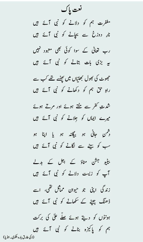 مغفرت ہم کو دلانے کو نبی آئے ہیں نارِ دوزخ سے بچانے کو نبی آئے ہیں رب تعالیٰ کے سوا کوئی بھی معبود نہیں یہ بڑی بات بتانے کو نبی آئے ہیں جھوٹ کی بھول بھلیّاں میں پھنسے تھے کب سے راہِ حق ہم کو دکھانے کو نبی آئے ہیں شدتِ کفر سے مٹتے ہوئے اور مرتے ہوئے میرے ایماں کو جِلانے کو نبی آئے ہیں دشمنِ جانی ہو بیگانہ ہو یا اپنا ہو سب کو سینے سے لگانے کو نبی آئے ہیں بیٹیو جشن مناؤ کے اجل کے بدلے آپ کو زیست دلانے کو نبی آئے ہیں زندگی اپنی جو حیوان مماثل تھی، اسے ڈھنگ جینے کے سکھانے کو نبی آئے ہیں ہونٹوں کو دیتے ہوئے صلّے علیٰ کی برکت ہم کو پاکیزہ بنانے کو نبی آئے ہیں (ذکی طارق بارہ بنکوی۔ انڈیا)