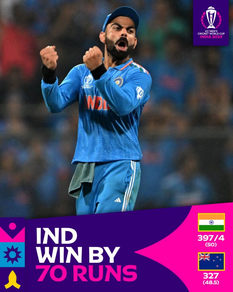 کرکٹ ورلڈ کپ پہلا سیمی فائنل بدھ،15نومبر2023ء بھارت بمقابلہ نیوزیلینڈ بمقام: ممبئی(Mumbai) ایک روزہ کرکٹ ورلڈ کپ 2023 کے پہلے سیمی فائنل میں بھارت نےنیوزیلینڈ کو 70رنز سے شکست دے دی۔اس بڑی جیت میں ویرات کوہلی(Virat Kohli) اور شریاس آئیر(Shreyas Iyer) کی سنیچریوں اورفاسٹ باؤلر محمد شامی (Mohammed Shami)کی سات وکٹوں نے اہم ترین کرداراداکیا۔ ممبئی کے تاریخی وانکھیڈے اسٹیڈیم میں کھیلے گئے مقابلہ میں بھارت کے کپتان روہت شرما (Rohit Sharma)نے ٹاس جیت کر ،بیٹنگ کے لیے سازگار پچ پر،بغیر کسی ہچکچاہٹ کے،پہلے بلے بازی کرنےکا فیصلہ کیا۔ روہت شرما نےاس ٹورنامنٹ میں اپنی حکمت عملی کو جاری رکھتے ہوئے ایک مرتبہ پھر جارحانہ انداز میں شروعات کیں اور صرف 5.2 اوورز میں ٹیم کی نصف سنچری مکمل کرڈالی۔شرما29 گیندوں پر چار چھکوں اور چار چوکوں کی مدد سے47 رنزبناکرٹم ساؤدھی(Tim Southee) کی گیند پرکین ولیمسن (Kane Williamson)کے شاندارکیچ کی بدولت آؤٹ ہوئے۔ ویرات کوہلی بلے بازی کرنے پہنچے تو پہلی ہی گیند پر نہایت قریبی معاملہ میں lbwہونے سے بچ گئے۔پھر انہوں نے شبمن گل (Shubman Gill) کے ساتھ مل کر 93رنز کی بہترین پارٹنرشپ قائم کی۔ شبمن گل 3 چھکوں اور 8 چوکوں کی مدد سے 79 رنز بنا کر ورلڈکپ میں اپنی اولین سینچری کی جانب گامزن تھے کہ پٹھوں میں کھچاؤ(cramps) کے باعث انہیں retired hurtہوکر پویلین واپس جاناپڑا۔اُس وقت تک بھارت نے ایک وکٹ کے نقصان پر 162 رنز بنارکھے تھے اور نیوز ی لینڈ کے لئے میچ میں واپسی کا ایک موقع تھا لیکن اِن فارم شریاس آئیر(Shreyas Iyer) نے آتے ہی بااعتماد بلےبازی کی اور کیوی باؤلرز پر دیکھتے دیکھتے حاوی ہوگئے۔ دوسری طرف سب نظریں کنگ کوہلی پر ٹکی تھیں کہ وہ اپنے ون ڈے کیرئیر کی 50ویں سینچری بنا پاتے ہیں یا نہیں! کوہلی نے 59 گیندوں پر نصف سنچری مکمل کی اورپھر نسبتاً تیزی سے رنز جوڑنے شروع کئے ۔انہوں نے شریاس آئیرکے ہمراہ 163 رنز کی لاجواب شراکت قائم کی۔ گزشتہ میچ میں نیدرلینڈز کے خلاف نصف سینچری بناکرآؤٹ ہونے والے ویرات کوہلی نے اس بارنئی تاریخ رقم کرنے کا نادر موقع نہ گنوایا اوروہ کردکھایا جو ون ڈے کرکٹ کی 52سالہ تاریخ میں کوئی بلے باز نہ کرسکا تھا۔5نومبر1988ءکو دہلی میں پیدا ہونے والے دنیائے کرکٹ کے عظیم ترین کھلاڑیوں میں سے ایک ،ویرات کوہلی(VIRAT KOHLI) نے ایک روزہ کیرئیر میں اپنی 50ویں سینچری مکمل کرکے ہم وطن سچن رمیش ٹنڈولکرکا ریکارڈ توڑدیا۔ ویرات کوہلی نے 113 گیندوں پر 2 چھکوں اور 9 چوکوں کی مدد سے 117 رنز بنا کر آؤٹ ہوئے تو بھارت کا مجموعی سکور327رنز تھا۔تاہم شریاس آئیر نے چھکوں اور چوکوں کی برسات جاری رکھی اورمحض 67 گیندوں پر ٹورنامنٹ میں اپنی لگاتاردوسری سینچری مکمل کی۔وہ 70 گیندوں پر 8 چھکوں اور 4 چوکوں کی مدد سے 105 رنز بنانے کے بعد آؤٹ ہوئے۔ اختتامی اوورز میں لوکیش راہول(KL Rahul) نےبھی جارحانہ بیٹنگ کی اور 20 گیندوں پر 2 چھکوں اور 5 چوکوں کی بدولت 39 رنز بنانے میں کامیاب رہے۔شبمن گل بھی دوبارہ بلے بازی کرنے آئے اور80کے سکورپر ناٹ آؤٹ واپس لوٹے۔ مقررہ 50اوورز میں بھارت نے 4 وکٹوں کے نقصان پر 397 رنز بنائے جوکہ ورلڈ کپ کی تاریخ میں کسی Knock-Outمقابلہ میں سب سے بڑا اسکور ہے۔ نیوزی لینڈ کی جانب سے ٹم ساؤدھی نے 100 رنز دے کر تین وکٹیں لیں جبکہ ٹرینٹ بولٹ86رنز کے عوض ایک کھلاڑی کو آؤٹ کرسکے۔ ہدف کے تعاقب میں نیوزی لینڈ کے اوپنرز نے پہلے پانچ اوورز میں 30 رنز کا آغاز فراہم کیا۔چھٹے اوور میں روہت شرما نے باؤلنگ میں تبدیلی کی اورٹورنامنٹ میں اپنے سب سے کامیاب باؤلر محمد شامی کو گیند تھمائی جنہوں نے اپنی پہلی ہی بال پر ڈیون کونوے کی اہم وکٹ حاصل کی ۔وکٹ کیپر راہول نے زبردست کیچ پکڑا۔پھر محمد شامی نے اپنے دوسرے اوور میں اِن فارم راچن رویندرا کی اننگز کا خاتمہ کر کے اپنی ٹیم کو دوسری کامیابی دلائی۔ تیسری وکٹ کی شراکت میں کپتان کین ولیمسن اورڈیرل مچل نے بہترین کھیل پیش کر کے اسکور میں اضافہ کرنا شروع کیا۔دونوں کھلاڑیوں نے بڑے ہدف اور دباؤ کے باوجود ذمہ دارانہ بلے بازی کرتے ہوئے 179 رنز کی شراکت قائم کی۔ایک مرحلے پ