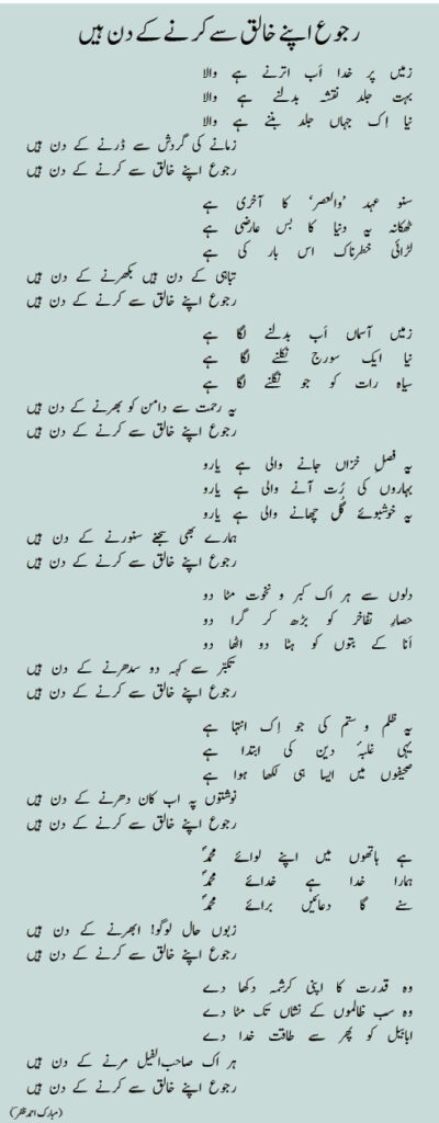 زمیں پر خدا اَب اترنے ہے والا بہت جلد نقشہ بدلنے ہے والا نیا اِک جہاں جلد بننے ہے والا زمانے کی گردش سے ڈرنے کے دن ہیں رجوع اپنے خالق سے کرنے کے دن ہیں سنو عہد ’والعصر‘ کا آخری ہے ٹھکانہ یہ دنیا کا بس عارضی ہے لڑائی خطرناک اس بار کی ہے تباہی کے دن ہیں بکھرنے کے دن ہیں رجوع اپنے خالق سے کرنے کے دن ہیں زمیں آسماں اَب بدلنے لگا ہے نیا ایک سورج نکلنے لگا ہے سیاہ رات کو جو نگلنے لگا ہے یہ رحمت سے دامن کو بھرنے کے دن ہیں رجوع اپنے خالق سے کرنے کے دن ہیں یہ فصلِ خزاں جانے والی ہے یارو بہاروں کی رُت آنے والی ہے یارو یہ خوشبوئے گُل چھانے والی ہے یارو ہمارے بھی سجنے سنورنے کے دن ہیں رجوع اپنے خالق سے کرنے کے دن ہیں دلوں سے ہر اک کبر و نخوت مٹا دو حصارِ تفاخر کو بڑھ کر گرا دو اَنا کے بتوں کو ہٹا دو اٹھا دو تکبّر سے کہہ دو سدھرنے کے دن ہیں رجوع اپنے خالق سے کرنے کے دن ہیں یہ ظلم و ستم کی جو اِک انتہا ہے یہی غلبۂ دین کی ابتدا ہے صحیفوں میں ایسا ہی لکھا ہوا ہے نوشتوں پہ اب کان دھرنے کے دن ہیں رجوع اپنے خالق سے کرنے کے دن ہیں ہے ہاتھوں میں اپنے لوائے محمدؐ ہمارا خدا ہے خدائے محمدؐ سنے گا دعائیں برائے محمدؐ زبوں حال لوگو! ابھرنے کے دن ہیں رجوع اپنے خالق سے کرنے کے دن ہیں وہ قدرت کا اپنی کرشمہ دکھا دے وہ سب ظالموں کے نشاں تک مٹا دے ابابیل کو پھر سے طاقت خدا دے ہر اک صاحب الفیل مرنے کے دن ہیں رجوع اپنے خالق سے کرنے کے دن ہیں (مبارک احمد ظفرؔ)