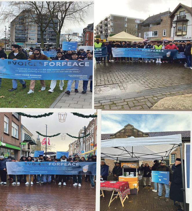 اللہ تعالیٰ کے فضل سے ہالینڈ کے چار شہروںHelmond, Deventer, Gouda اورHilversum میں مورخہ ۲۵؍ نومبر ۲۰۲۳ء کو امن کے پیغام کو پھیلانے کے لیے پیس واک منعقد کی گئی۔ اس کا موضوع VOICESFORPEACE#تھا۔ اس پروگرام کا مقصد لوگوں کو اسلام کی پُرامن خوبصورت تعلیم کے بارے میں بتانا تھا۔ سب سے پہلے اس پروگرام کے حوالے سے متعلقہ شہروں کے گرد و نواح میں امن کے حوالے سے فولڈرز گھروں میں ڈالے گئے جس پر VOICESFORPEACE# اور حضور انور ایدہ اللہ تعالیٰ بنصرہ العزیز کے بیان فرمودہ امن کے حوالے سے ۹؍ نکات لکھے گئے تھے۔ یہ پیس واک شہروں کے سنٹر میں منعقد ہوئی جہاں زیادہ ہجوم ہوتا ہے تاکہ زیادہ لوگوں تک پیغام پہنچ سکے۔لوگوں نے اس پیس واک کو سراہا اور اچھے تاثرات لوگوں کی طرف سے موصول ہوئے۔ اس کے علاوہ میڈیا کوریج بھی ملی۔ مختلف اخباروں نے ان پروگرامز کی کوریج کی اور لوگوں سے بھی تاثرات لیے۔ اس پروگرام میں ہر شہر میں ۵۰ سے ۷۰؍ احباب شامل ہوئے۔ الحمد للہ یہ پروگرام بہت کامیاب رہا۔دعا ہے کہ اللہ تعالیٰ اس پروگرام کے نیک نتائج پیدا کرے۔ آمین