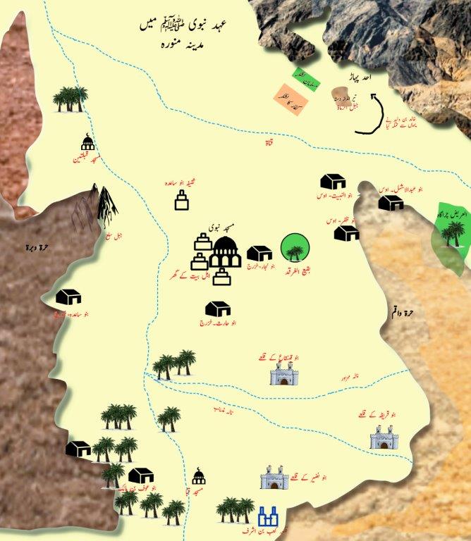 https://youtu.be/fpPbuKpmfcQ خطبہ جمعہ بیان فرمودہ یکم دسمبر ۲۰۲۳ءمیں حضور انور ایدہ اللہ تعالیٰ بنصرہ العزیز نے غزوہ احد کے اسباب بننے کے واقعات اور مشرکین مکّہ کی جنگ کی تیاریوں اور مدینہ پر حملہ کے سفر کے حالات بیان فرمائے ۔ اس خطبہ میں مذکور مقامات کا جغرافیائی تعارف پیش خدمت ہے۔ دارالندوة: دور جہالت میں مکہ مکرمہ میں قریش کے ایک سردار قصی بن کلاب نے قریش کے جمع ہونے اور ضروری سیاسی اور اجتماعی امور پر مشاورت اور باہمی فیصلےکرنے کے لیے ایک مکان تعمیر کیا تھا جسے دار الندوة کہتے ہیں۔ قصی بن کلاب خود بھی یہیں قیام پذیر تھا۔ یہ مسجد حرام کے غربی سمت تھا اور اس کا دروازہ کعبہ کی طرف کھلتا تھا۔ قریش کے بڑے لوگ( جن کی عمر ۴۰ سال سے زائد ہو) اور سردار اس کے رکن تھے اور صرف انہی ارکان کو یہاں آنے کی اجازت ہوا کرتی تھی۔ قصی بن کلاب کی تعمیر سے قبل خانہ کعبہ کے اردگرد مکان کی تعمیر نہیں تھی۔ قصی بن کلاب کے گھر بنانے کے بعد پھر دیگر لوگوں نے بھی کعبہ کے اطراف میں گھر بنانے شروع کیے گویا مکہ کی جدید تعمیر قصی بن کلاب کی مرہون منت ہے۔قریش اپنی اہم رسومات، تجارتی قافلوں کی روانگی ، شادی بیاہ کی رسومات،جنگ کی تیاری وغیرہ بھی یہاں ہی کرتے تھے۔ اس جگہ بہت سے اہم فیصلے ہوئے جن میں بنی خزاعہ اور بنی ہاشم میں معاہدہ اور معاہدہ حلف الفضول شامل ہیں۔ آغا ز اسلام کے بعدر سول اللہﷺ کو (نعوذ باللہ ) شہید کرنے کا منصوبہ بھی قریش مکہ نے اسی مقام پر بنایا جس کے بعد آپﷺ نے مکہ سے مدینہ ہجرت فرمائی۔ جنگ احد کا فیصلہ اور تیاری بھی دارالندوة میں ہوئی۔ جب مسجد حرام کی توسیع ہوئی تو دارالندوة کا مقام بھی اس میں شامل ہو گیا۔ العریض چرا گاہ: العریض مدینہ کی غربی جانب ایک چراگاہ تھی جس کا مسجد نبوی سے فاصلہ تقریباً ساڑھے چار کلومیٹر تھا ۔ یہ چرا گاہ حرة کے بیرونی جانب تھی ۔مدینہ کے لوگ اپنےجانور اس جگہ چراتے تھے۔موجودہ زمانے میں یہ تمام جگہ مدینہ کی شہری آبادی میں شامل ہے اور لوگوں کے مکانات یہاں تعمیر ہیں۔ قبا بستی : قبا مدینہ کے جنوبی طرف مدینہ کی ایک نواحی بستی تھی۔اس کی وجہ تسمیہ یہ بتائی جاتی ہے کہ یہاں ایک چشمہ تھا جسے قبا کہتے تھے اس کی وجہ سے اس مقام کو قبا کہاجانے لگا۔ اس مقام کو یہ شرف حاصل ہوا کہ رسول اللہ ﷺ اور حضرت ابو بکر ؓ ہجرت کر کے سب سے پہلے قبا پہنچے اور یہاں ۱۴روز قیام فرمایا۔ پھر آپ مدینہ میں داخل ہوئے۔اسی دوران یہاں مسجد کی بنیاد بھی رکھی جسے مسجد قبا کہتے ہیں۔ اس کا مسجد نبویؐ سے ۳.۷کلومیٹر کا فاصلہ ہے۔مدینہ میں قیام کے دوران رسول اللہﷺ متعدد مرتبہ یہاں تشریف لاتے اور نماز ادا فرماتے تھے۔ اِس وقت یہ جگہ مدینہ میں شامل ہے اور یہاں کافی شاندار مسجد قبا موجود ہے۔ احد پہاڑ: مدینہ منورہ کے شمالی جانب ایک پہاڑ ہے جو مسجد نبوی سے تقریباً ۶؍کلومیٹر کے فاصلے پر ہے ۔ موجودہ زمانے میں مدینہ کی آبادی اس پہاڑ تک پہنچ گئی ہے اور اس کے اردگرد پھیلی ہوئی ہے۔احد پہاڑ کی لمبائی مشرق سے مغرب کی جانب تقریباً ۶؍کلومیٹر ہے اور اس کا رنگ سرخی مائل ہے۔ اس وقت احد کےجنوب میں غزوہ احد کے شہداء کی قبریں ہیں۔ جس سے کچھ پیچھے پہاڑی پر وہ غار اور مقام ہے جہاں صحابہ کرامؓ اور رسول اللہﷺ نے غزوہ احد کے بعد پناہ لی۔ شہداء کی قبروں سے پہلے وہ چھوٹی سی پہاڑی ہے جس پر رسول اللہﷺ نے ۵۰؍تیر انداز صحابہؓ کو کھڑا کیا تھا۔ اس کو جبل الرماة اور جبل عینین بھی کہتے ہیں۔ جنگ کے میدا ن میں اس وقت ایک عالیشان مسجد تعمیر ہے۔