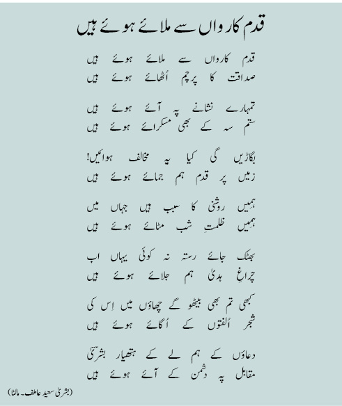 قدم کارواں سے ملائے ہوئے ہیں صداقت کا پرچم اُٹھائے ہوئے ہیں تمہارے نشانے پہ آئے ہوئے ہیں ستم سہ کے بھی مسکرائے ہوئے ہیں بگاڑیں گی کیا یہ مخالف ہوائیں! زمیں پر قدم ہم جمائے ہوئے ہیں ہمِیں روشنی کا سبب ہیں جہاں میں ہمِیں ظلمتِ شب مٹائے ہوئے ہیں بھٹک جائے رستہ نہ کوئی یہاں اب چراغِ ہدیٰ ہم جلائے ہوئے ہیں کبھی تم بھی بیٹھو گے چھاؤں میں اِس کی شجر اُلفتوں کے اُگائے ہوئے ہیں دعاؤں کے ہم لے کے ہتھیار بشرؔیٰ مقابل پہ دشمن کے آئے ہوئے ہیں (بشریٰ سعید عاطف۔ مالٹا)