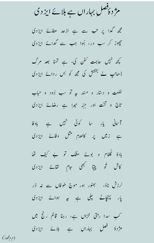 مجھ گدا پر تب سے ہے ازحد عطائے ایزدی چھوڑ کر سب در، ہُوا جب سے گدائے ایزدی کچھ نہیں حاجت کفن کی، ہے تمنا بعد مرگ ڈھانپ لے بخشش کی مجھ کو بس ردائے ایزدی خلعت و دستار و مسند یہ تو سب دُود و حباب تاج و تخت اور جبّہ میرا ہے رضائے ایزدی آسمانی یار سا کوئی نہیں ہے باوفا ہے زمیں پر کالعدم مثلِ وفائے ایزدی بادۂ گُلفام و بوئے مشک تو بے کیف تھا کاش تُو پیتا کبھی جامِ لقائے ایزدی لرزشِ ناؤ، بھنور اور موجِ طوفاں سے نہ ڈر پار پہنچانے چلی ہے یہ ہوائے ایزدی کب سدا رہتی خزاں ہے، رہنا قائم رنج میں مژدۂ فصلِ بہاراں ہے بلائے ایزدی (م م محمود ؔ)