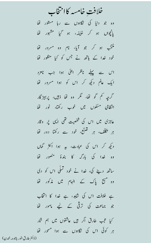 وہ جو دنیا کی نگاہوں سے رہا مستور تھا پانچواں ہو کر خلیفہ، ہو گیا مشہور تھا منتخب ہو کر جو آیا، نام وہ مسرور تھا خود خدا کے ہاتھ نے جس کو کیا منظور تھا اس سے پہلے ناظرِ اعلیٰ ہوا جب نامزد ایک عالم دیکھ کر اس کو ہوا مسرور تھا گرچہ کم گو تھا، مگر وہ تھا ذہیں، پرہیزگار انتظامی مسئلوں میں خوب رکھتا، نور تھا عاجزی میں اس کی شخصیت تھی ایسی پُر وقار ہر تکلّف، ہر تصنّع، خود سے رکھتا دور تھا دیکھ کر اس کی عبادت، یہ ہوا اکثر گماں وہ خدا کی بارگہ کا بندۂ منصور تھا ساتھ دینے کی، خدا نے خود تسلّی اس کو دی وہ مسیحِ پاک کے الہام میں مذکور تھا ہے خلافت اس کی شاہد، ہے خدا کا انتخاب جو جماعت کی ترقّی کے لیے مامور تھا کیا عجب طارق اگر ہیں عاشقوں میں ہم شمار ہر کوئی اس کی نگاہوں سے ہوا مسحور تھا (ڈاکٹر طارق انور باجوہ۔ لندن)