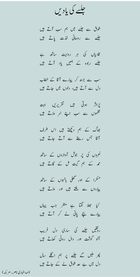 https://youtu.be/QB-5mGunCWA شوق سے جلسے میں ہم سب آتے ہیں جلسے سے روحانی لذت پاتے ہیں قادیاں کی ہر روایت ساتھ ہے جلسے ربوہ کے ہمیں یاد آتے ہیں سب سے بڑھ کر پیارے آقا کے خطاب دل سے آتے ہیں، دلوں میں جاتے ہیں پُراثر ہوتی ہیں تقریریں بہت نظموں سے سب اپنے سُر ملاتے ہیں بھاگ کے ہم دیکھتے ہیں اس طرف آقا جس رستے سے آتے جاتے ہیں نعروں کی پُر جوش آوازوں کے ساتھ حمد کے ہم گیت مل کے گاتے ہیں مسکرا کے اور کھلی بانہوں کے ساتھ پیاروں سے ملتے ہیں اور ملاتے ہیں کیا بھلا لگتا ہے منظر جب یہاں پیارے بچے پانی لے کر آتے ہیں رونقیں جلسے کی ساری دل فریب آلو گوشت اور دال روٹی کھاتے ہیں پھر ملیں گے جلسے پر ہم اگلے سال دل میں بے حد شوق لے کے جاتے ہیں (امۃ الباری ناصر۔ امریکہ)