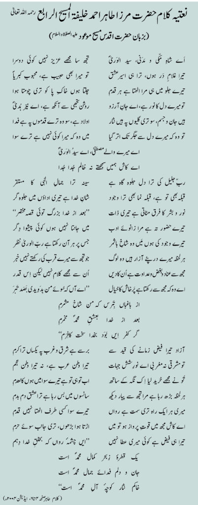 (بزبان حضرت اقدس مسیح موعود علیہ الصلوٰۃ و السلام) اَے شاہِ مکّی و مَدَنی، سید الوَریٰؐ تجھ سا مجھے عزیز نہیں کوئی دوسراتیرا غلامِ دَر ہوں، ترا ہی اسیر عشق تو میرا بھی حبیب ہے، محبوبِ کبریاؐتیرے جِلو میں ہی مرا اٹھتا ہے ہر قدم چلتا ہوں خاکِ پا کو تری چومتا ہواتو میرے دل کا نور ہے، اے جانِ آرزو روشن تجھی سے آنکھ ہے، اے نیّرِ ہُدیٰؐہیں جان و جسم، سو تری گلیوں پہ ہیں نثار اولاد ہے، سو وہ ترے قدموں پہ ہے فداتو وہ کہ میرے دل سے جگر تک اتر گیا میں وہ کہ میرا کوئی نہیں ہے ترے سوا اے میرے والے مصطفیٰ، اے سیدُ الوَریٰؐاے کاش ہمیں سمجھتے نہ ظالم جُدا جُدا ربِّ جلیل کی ترا دل جلوہ گاہ ہے سینہ ترا جمالِ الٰہی کا مستقرقبلہ بھی تو ہے، قبلہ نما بھی ترا وجود شانِ خدا ہے تیری اداؤں میں جلوہ گرنور و بشر کا فرق مٹاتی ہے تیری ذات ’’بعد از خدا بزرگ توئی قصہ مختصر‘‘تیرے حضور تہ ہے مرا زانوئے ادب میں جانتا نہیں ہوں کوئی پیشوا دِگرتیرے وجود کی ہوں مَیں وہ شاخِ باثمر جس پر ہر آن رکھتا ہے ربّ الوریٰ نظرہر لحظہ میرے درپئے آزار ہیں وہ لوگ جو تجھ سے میرے قرب کی رکھتے نہیں خبرمجھ سے عناد و بغض و عداوت ہے اُن کا دیں اُن سے مجھے کلام نہیں لیکن اِس قدراے وہ کہ مجھ سے رکھتا ہے پَرخاش کا خیال ’’اے آں کہ سُوئے من بِدَوِیدی بَصَد تَبرَ از باغباں بِتَرس کہ من شاخ مثمرمبعد از خدا بعشقِ محمدؐ مخمرمگر کفر اِیں بَوَد بخدا سخت کافِرَم‘‘ آزاد تیرا فیض زمانے کی قید سے برسے ہے شرق و غرب پہ یکساں ترا کرمتو مشرقی نہ مغربی اے نورِ شش جہات تیرا وطن عرب ہے، نہ تیرا وطن عجمتُو نے مجھے خرید لیا اِک نگہ کے ساتھ اب تو ہی تو ہے تیرے سوا میں ہوں کالعدمہر لحظہ بڑھ رہا ہے مرا تجھ سے پیار دیکھ سانسوں میں بس رہا ہے ترا عشق دم بدممیری ہر ایک راہ تری سمت ہے رواں تیرے سوا کسی طرف اٹھتا نہیں قدماے کاش مجھ میں قوتِ پرواز ہو تو میں اڑتا ہوا بڑھوں، تری جانب سوئے حرمتیرا ہی فیض ہے کوئی میری عطا نہیں ’’ایں چشمۂ رواں کہ بخلقِ خدا دِہم یک قطرۂ زِبحر کمال محمدؐ استجان و دلم فدائے جمال محمدؐ استخاکم نثار کوچۂ آلِ محمدؐ است‘‘