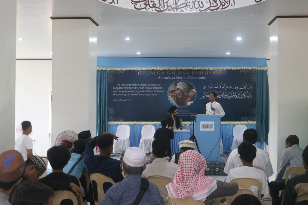https://youtu.be/A9akRzkbV5k ٭… جلسہ سالانہ کے موقع پر حضور انور ایدہ اللہ تعالیٰ بنصرہ العزیز کا احباب جماعت کے نام خصوصی پیغام ٭… ’’شرائط بیعت‘‘ کے مرکزی موضوع پرعلمی و تربیتی تقاریر کا اہتمام ٭… جلسہ سالانہ میں ۳۵۰؍احباب کی شمولیت ٭… جلسہ سالانہ کے ساتھ ساتھ چوتھی مجلس شوریٰ کا بھی انعقاد محض اللہ تعالیٰ کے فضل سے جماعت احمدیہ فلپائن کو ۲۸تا۳۰؍جون ۲۰۲۴ء کو اپنا سترھواں جلسہ سالانہ منعقد کرنے کی توفیق ملی۔ امسال تقریباً دس سال کے عرصہ کے بعد جلسہ سالانہ ایک بار پھر سے جماعت کی اپنی زمین پر منعقد ہوا۔ نیز کورونا وائرس کے بعد یہ پہلا تین روزہ جلسہ سالانہ تھا۔ جماعت احمدیہ فلپائن کی خوش قسمتی ہے کہ اس سال بھی حضرت امیر المومنین خلیفۃ المسیح الخامس ایّدہ اللہ تعالیٰ بنصرہ العزیز نے جلسہ سالانہ کے لیے خصوصی پیغام ارسال فرمایا۔ ہمیشہ کی طرح جلسہ سالانہ کی تیاری جلسہ سے کئی ماہ پہلے شروع ہوگئی تھی۔ اس سال جلسہ سالانہ کا مرکزی موضوع ’’شرائط بیعت‘‘ تھا اور جلسہ کی تقاریر اور سٹیج اسی موضوع پر تیار کیا گیا تھا۔ جلسہ کا آغاز نماز جمعہ کی ادائیگی کے ساتھ ہوا۔ خطبہ جمعہ میں مکرم محمد رزاری صاحب معلم سلسلہ نے جلسہ سالانہ کی غرض و غایت بیان کی نیز شاملین جلسہ کی ذمہ داریوں کی طرف توجہ دلائی اور پھر جمعہ کی نماز پڑھائی۔ اس کے معاً بعد پرچم کشائی کی تقریب منعقد ہوئی۔ جماعت احمدیہ کا پرچم خاکسار (مربی سلسلہ و صدر جماعت)نے جبکہ فلپائن کا پرچم مکرم اسماعیل منکابونگ صاحب جو کہ جلسہ میں شامل سب سے پرانے اور بزرگ احمدی تھے نے لہرایا۔ پرچم کشائی کے بعد جلسہ کے پہلے اجلاس کی کارروائی کا آغاز ہوا جس کی صدارت مکرم عبدالمخلص صاحب نائب صدر و مقامی مشنری نے کی۔ تلاوت قرآن کریم و ترجمہ، اردو نظم اور اس کے ترجمہ کے بعد مکرم فیلان ہیڈنگ صاحب معلم سلسلہ نے جلسہ سالانہ کے موقع پر حضور انور ایدہ اللہ تعالیٰ بنصرہ العزیز کی طرف سے موصول ہونے والا خصوصی پیغام انگریزی میں اور اس کا تگالوگ ترجمہ بھی پڑھ کر سنایا۔ صدر مجلس نے اپنی افتتاحی تقریر میں حضور انور ایدہ اللہ تعالیٰ بنصرہ العزیز کے پیغام میں مذکور نصائح پر عمل کرنے کی تلقین کی۔ بعد ازاں مکرم جبرائیل کریم ارصد صاحب نے ’’پہلی اور پانچویں شرط بیعت کی روشنی میں حقوق اللہ کی ادائیگی‘‘ کے موضوع پر اورپھر مکرم صالح یوسا سہود صاحب صدر مجلس خدام الاحمدیہ نے ’’چوتھی اور نویں شرائط بیعت کی روشنی میں حقوق اللہ کی ادائیگی کی اہمیت‘‘ کے موضوعات پر تقاریر کیں۔ جلسہ کےتینوں روز شام میں چائے اور کافی کا انتظام تھا نیز تینوں روز نماز مغرب و عشاء کے درمیانی وقفہ میں مجالس عرفان منعقد کی گئیں جن میں احباب جماعت نے خاص شوق سے شمولیت کی۔ احباب جماعت کی طرف سے کیے جانے والے سوالات مختلف نوعیت کے تھے جن میں فقہی مسائل ، اختلافی مسائل، سائنس، عصر حاضر میں پیش آنے والی مشکلات اور ہستی باری تعالیٰ کے دلائل جیسے موضوعات شامل تھے۔ دوسرے روز کا آغاز نماز تہجد، فجر اور درس القرآن کے ساتھ ہوا۔ ناشتہ کے بعد جلسہ کا دوسرا اجلاس منعقد ہوا۔ اس اجلاس میں خاص طور پر غیر از جماعت مہمانوں کو مدعو کیا گیا تھا۔ تلاوت قرآن کریم اور عربی قصیدہ کے بعد مہمانوں نے تقاریر کیں۔ اس اجلاس کا مرکزی موضوع ’’حقوق اللہ اور حقوق العبا دکی ادائیگی کے بغیر امن عامہ کا قیام ممکن نہیں‘‘ تھا۔ مہمانوں میں ایک اٹالین پادری صاحب جو گذشتہ ۴۰؍سال سے زائد عرصہ سے فلپائن میں مقیم ہیں اور کیتھولک چرچ اور حکومت کے کئی اہم عہدوں پر فائز رہ چکے ہیں نے اپنی تقریر میں جماعت احمدیہ کی امن عامہ کے لیے کوششوں کو سراہا۔ اس کے بعد مقامی شہر کے نمائندہ اور پولیس کے نمائندہ نے بھی تقاریر کیں۔ اس اجلاس میں فوج اور میڈیا کے نمائندے بھی شامل تھے۔ میڈیا کی طرف سے جلسہ کی کوریج کے علاوہ خاکسار اور مقامی معلم صاحب کے انٹرویو بھی لیے۔ اس اجلاس کے آخر میں خاکسار نے ’’آنحضرت ﷺ- حقوق اللہ اور حقوق العباد کی ادائیگی کے لیے اسوۂ حسنہ‘‘ کے موضوع پر 