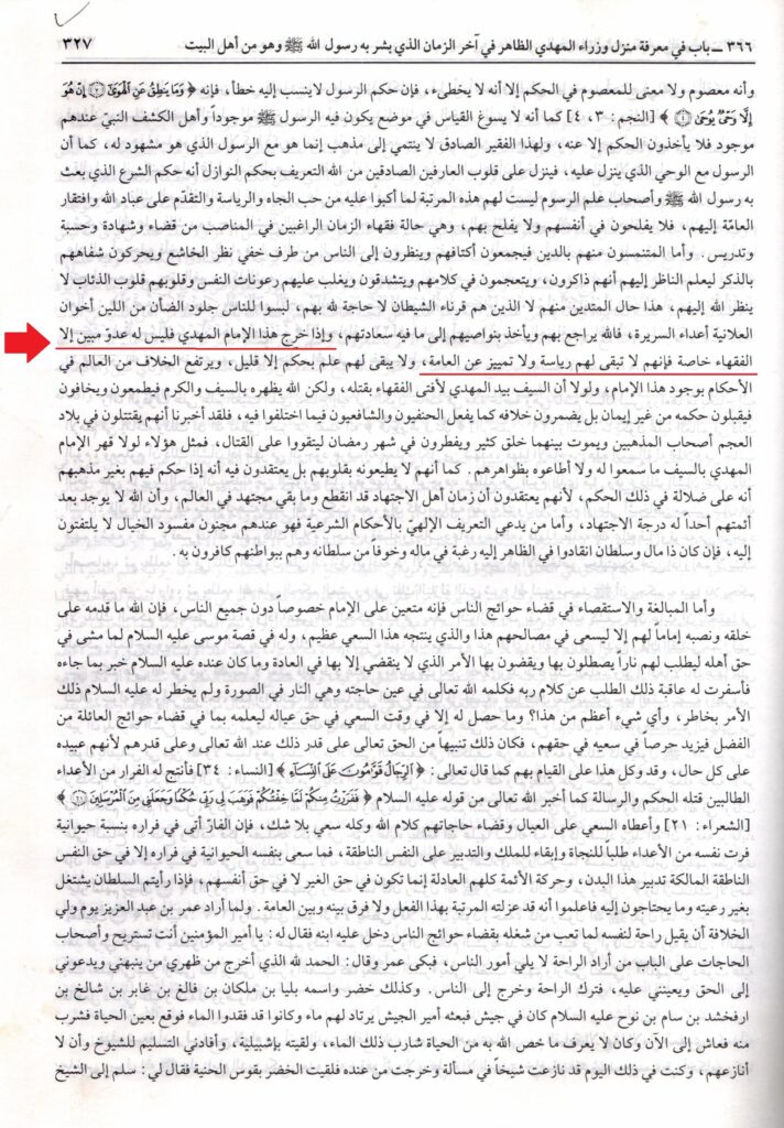 ۴:۔حضرت مجدّد الف ثانی رحمۃ اللہ علیہ فرماتے ہیں کہ ’’علمائے ظواہر مجتہداتِ اُو رَا علی نبیّنا وعلیہ الصّلوۃ والسّلام از کمالِ دقّت وغموضِ ماخذ انکار نمائند ومخالفِ کتاب وسنّت دانند۔‘‘ (مکتوبات۔ امام ربانی حضرت مجدّد الف ثانی۔ دفتر دوم۔ حصہ ہفتم صفحہ ۱۴ مکتوب نمبر ۵۵)یعنی علمائے ظواہر امام مہدی علیہ السلام کے اجتہادات کا انکار کریں گے اور ان کو قرآن مجید اور سنت نبوی کے خلاف قرار دیں گے کیونکہ وہ بباعث کمال دقیق ہونے اور ان کے ماخذ کے مخفی ہونے کے علماء کی سمجھ سے بالا ہوں گے۔