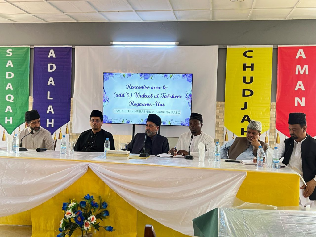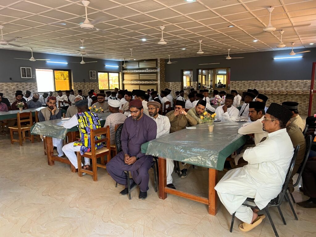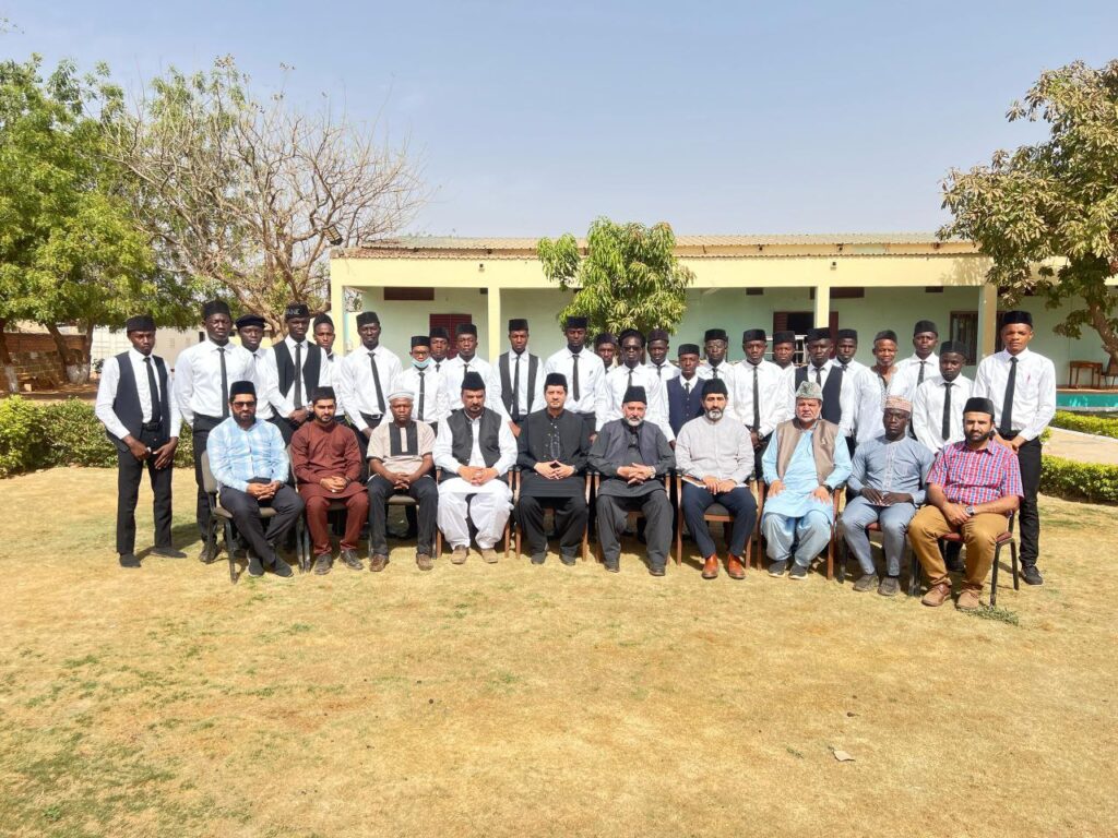 https://youtu.be/QPEdwBSLhUg اللہ تعالیٰ کے فضل و کرم سے جامعۃ المبشرین برکینا فاسو میں مجلس ارشاد کے تحت مورخہ ۲۶؍فروری ۲۰۲۵ء کو ایک نشست منعقد ہوئی جس میں مکرم عبدالماجد طاہر صاحب ایڈیشنل وکیل التبشیر یوکے بطور نمائندہ حضرت خلیفۃ المسیح الخامس ایدہ اللہ تعالیٰ بنصرہ العزیز اور مکرم حافظ اعجاز احمد طاہر صاحب مربی سلسلہ و نائب صدر صف دوم مجلس انصار اللہ یوکے نے شرکت کی۔ یہ معزز مہمانان مسرور میڈیکل کمپلیکس، برکینا فاسو کے افتتاح کے موقع پر دورہ پر تشریف لائے ہوئے تھے۔ طلبہ و سٹاف نے صبح گیارہ بجے مہمانان گرامی کا جامعۃ المبشرین میں استقبال کیا۔ جامعہ میں سالانہ کھیلوں کا انعقاد ہورہا تھا اور اس موقع پر مہمانان کی موجودگی میں میوزیکل چیئرز کا مقابلہ منعقد کیا گیا جس میں برکینافاسو میں خدمات سرانجام دینے والے تمام مرکزی مبلغین، جامعہ کا سٹاف اور مہمانان نے شرکت کی۔ مقابلہ بانفورا کے ریجنل مشنری مکرم بشارت علی صاحب نے جیتا اور انہیں مکرم ایڈیشنل وکیل التبشیر صاحب نے انعام سے نوازا۔ بعد ازاں معزز وفد نے جامعہ کے مختلف شعبہ جات کا دورہ کیا جن میں جامعہ دفتر، کلاس رومز، ہوسٹل، کچن، سٹاف کوارٹرز اور مدرسۃ الحفظ شامل تھے۔ اس کے بعد مہمانان ہال میں نشست کے لیے تشریف لائے۔ نشست کا آغاز تلاوت قرآن کریم و ترجمہ اور نظم سے ہوا۔ بعد ازاں مکرم چودھری نعیم احمد باجوہ صاحب پرنسپل جامعۃ المبشرین برکینا فاسو نے معزز مہمانان کا تعارف کرایا۔ بعدازاں مہمانان نے طلبہ کو خلافت سے وفاداری، مربیان کرام کی روحانی ترقی، جماعت احمدیہ کے لیے مفید وجود بننے، وقف کے عہد کو نبھانے اور خلافت کی کامل اطاعت جیسے اہم موضوعات پر نصائح کیں اور متعدد واقعات کے ذریعے ان پہلوؤں پر روشنی ڈالی۔ اس کے بعد سوال و جواب کا سلسلہ منعقد ہوا جس میں طلبہ نے مہمانان سے مختلف امور پر راہنمائی حاصل کی۔نشست کے اختتام پر مکرم پرنسپل صاحب نے مہمانان کا شکریہ ادا کیا۔ دعا کے بعد جامعہ کے طلبہ، سٹاف اور مربیان کرام کے ساتھ گروپ فوٹو لیا گیا۔ نماز ظہر و عصر کی ادائیگی کے بعد مہمانان کی خدمت میں ظہرانہ پیش کیا گیا۔ اس کے بعد مہمانان نے سٹاف کوارٹرز کا دورہ کیا اور جامعہ کے احاطے میں آم کا ایک یادگاری پودا لگایا۔ (رپورٹ: محمد اظہار احمد راجہ۔ نمائندہ الفضل انٹرنیشنل) ٭…٭…٭ مزید پڑھیں: مالی کے سیگو فیسٹیول میں جماعت احمدیہ کا بُک سٹینڈ