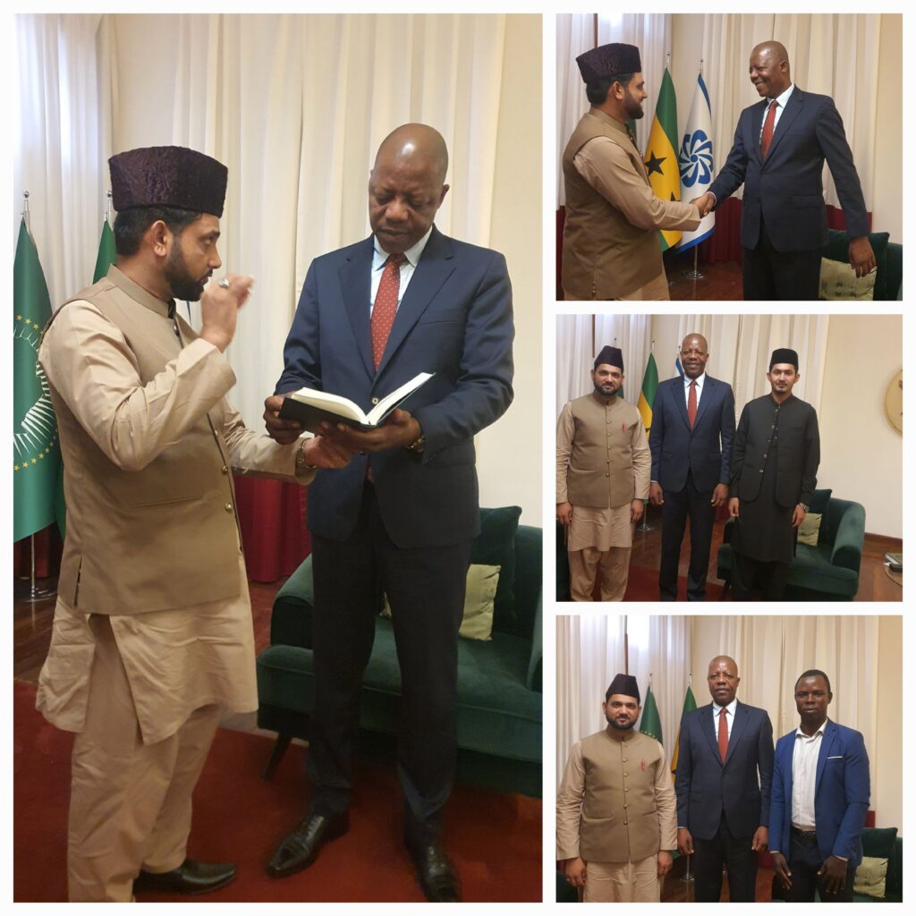 https://youtu.be/Yg5Y4bdYJkI اللہ تعالیٰ کے فضل سے ساؤٹومے کے بعض سیاستدانوں سے جماعت احمدیہ کے وفد کو ملاقات کرنے کا موقع ملا جس دوران انہیں جماعت احمدیہ کا تعارف کرایا گیا نیز جماعت کی مساعی اور سرگرمیوں سے آگاہ کیا گیا۔ ان ملاقاتوں کی تفصیل پیش خدمت ہے۔ ساؤٹومے کےنئے وزیراعظم سے جماعتی وفد کی ملاقات مورخہ ۱۰؍فروری ۲۰۲۵ء کو ساؤٹومے کے نئے مقرر ہونے والے وزیراعظم جناب امیریکو راموش سے جماعت احمدیہ کے وفد کو ملاقات کا موقع ملا۔ یاد رہے کہ جنوری ۲۰۲۵ء کے اوائل میں صدر ساؤٹومے نے حکومت کو برطرف کر کے نیا وزیراعظم مقرر کیا تھا۔ وزیر اعظم سے ملاقات وزیراعظم صاحب سے جماعت کا پہلے براہ راست رابطہ نہیں تھا تاہم ان کی کابینہ کے ممبران نے جو جماعت سے بخوبی واقف تھے پہلے ہی انہیں بریفنگ دے دی تھی۔ ملاقات کے دوران وزیراعظم صاحب کو جماعت احمدیہ کا تفصیلی تعارف پیش کیا گیا اور ساؤٹومے میں جاری جماعتی سرگرمیوں سے آگاہ کیا گیا جنہیں انہوں نے سراہا اور مل کر قوم کی خدمت کرنے کی یقین دہانی کرائی۔ انہیں اس موقع پر قرآن کریم کا پرتگیزی ترجمہ بطور تحفہ پیش کیا گیا اور جماعت کی سرگرمیوں کی ایک تفصیلی رپورٹ بھی کتابی شکل میں پیش کی گئی۔جماعتی وفد میں خاکسار (مبلغ سلسلہ و صدر جماعت) کے ساتھ مکرم سلیمان یوسف صاحب لوکل مشنری اور مکرم نبیل احمد رفیق صاحب مرکزی مبلغ ساؤٹومے شامل تھے۔ احتساب عدالت کے صدر سے تعارفی نشست مورخہ ۱۸؍فروری کو خاکسار کو ساؤٹومے کی احتساب عدالت کے صدر جناب ریکاردینو کوشتا سے ایک خصوصی ملاقات کرنے کا موقع ملا۔ ان سے پہلے بھی مختلف سرکاری پروگراموں میں ملاقات ہوتی رہتی تھی۔ اس بار باضابطہ تعارفی نشست کا اہتمام کیا گیا تاکہ جماعت احمدیہ کا تفصیلی تعارف پیش کیا جا سکے۔ احتساب عدالت کے صدر سےملاقات ملاقات کے دوران صدر عدالت نے اعتراف کیا کہ جماعت احمدیہ کی خدمات کا تذکرہ مختلف حلقوں میں ہوتا رہتا ہے اور ساؤٹومے میں جماعت کو عزت و احترام کی نظر سے دیکھا جاتا ہے۔ انہوں نے جماعت کے مالی نظام کے حوالے سے بھی استفسار کیے جس پر انہیں تفصیلی معلومات فراہم کی گئیں جسے سن کر موصوف بے حد متاثر ہوئے۔یہ ملاقات نہایت خوشگوار ماحول میں ہوئی جس میں صدر عدالت کی کابینہ کی سیکرٹری بھی موجود تھیں۔ انہوں نے میٹنگ کے نکات نوٹ کیے اور جماعت احمدیہ سے متعلق مزید سوالات کیے خصوصاً جماعت کے خلاف ہونے والی بعض مخالفتوں کے پس منظر میں دلچسپی لی۔ وزیر دفاع سے ملاقات، جماعت کا تعارف اور بریفنگ مورخہ ۲۱؍فروری کو نئے مقرر ہونے والے وزیر دفاع جناب اوراسیو سوزا سے ملاقات ہوئی۔ اس موقع پر انہیں جماعت احمدیہ کا تفصیلی تعارف کرایا گیا اور جماعت کے مختلف پروگراموں کے بارے میں آگاہ کیا گیا۔ وزیر موصوف نے جماعت کی فلاحی اور سماجی خدمات کو سراہا اور یقین دہانی کرائی کہ وہ ملک و قوم کی خدمت میں جماعت کے ساتھ تعاون جاری رکھیں گے۔ وزیر دفاع سے ملاقات انہوں نے جماعتی وفد کا شکریہ ادا کرتے ہوئے کہا کہ وہ پہلے بھی جماعت احمدیہ کے پروگراموں کو ٹی وی اور سوشل میڈیا پر دیکھتے رہتے ہیں تاہم جماعت کے بارے میں تفصیلات کا زیادہ علم نہیں تھا۔ اس ملاقات کے دوران انہیں اسلام احمدیت کی حقیقی تعلیمات سے روشناس کرایا گیا اور بتایا کہ جماعت احمدیہ حقیقی طور پر اسلام کی نمائندہ جماعت ہے۔ وزیر صحت سے ملاقات اور ہیومینٹی فرسٹ کی خدمات مورخہ ۲۵؍فروری کو نئے وزیر صحت جناب سیلسیو ماتوش سے خاکسار کی پہلی دفتری ملاقات ہوئی۔ یہ بھی حال ہی میں وزیر بنے ہیں لیکن پہلے ہی ان کو جماعت کا تعارف حاصل تھا اور مختلف سرکاری و سماجی پروگراموں میں ملاقات ہو چکی تھی۔ وزیر صحت سے ملاقات اس ملاقات میں خاکسار کے ساتھ ہیومینٹی فرسٹ جرمنی کے سوشل ورک ڈائریکٹر مکرم رازق احمد طارق صاحب اور مکرم تلمیذ احمد صاحب آف جرمنی بھی شامل تھے۔ وزیر صحت نے جماعت احمدیہ اور ہیومینٹی فرسٹ کے فلاحی کاموں کی بے حد تعریف کی اور کہا کہ ممکن ہے ہمیں خود اس بات کا اندازہ نہ ہو لیکن جماعت احمدیہ کا نام 