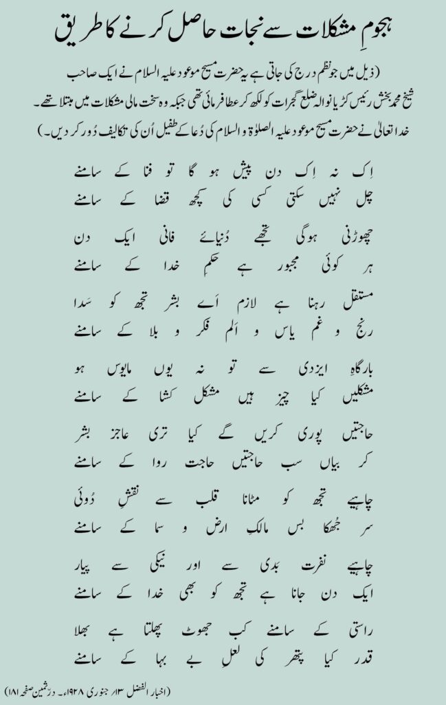 (ذیل میں جو نظم درج کی جاتی ہے یہ حضرت مسیح موعود علیہ السلام نے ایک صاحبشیخ محمد بخش رئیس کڑیانوالہ ضلع گجرات کو لکھ کر عطا فرمائی تھی جبکہ وہ سخت مالی مشکلات میں مبتلا تھے۔خدا تعالیٰ نے حضرت مسیح موعود علیہ الصلوٰۃ و السلام کی دُعا کے طفیل اُن کی تکالیف دُور کر دیں۔) اِک نہ اِک دن پیش ہو گا تو فنا کے سامنےچل نہیں سکتی کسی کی کچھ قضا کے سامنے چھوڑنی ہوگی تجھے دُنیائے فانی ایک دنہر کوئی مجبور ہے حکمِ خدا کے سامنے مستقل رہنا ہے لازم اَے بشر تجھ کو سَدارنج و غم یاس و اَلم فکر و بلا کے سامنے بارگاہِ ایزدی سے تو نہ یوں مایوس ہومشکلیں کیا چیز ہیں مشکل کشا کے سامنے حاجتیں پوری کریں گے کیا تری عاجز بشرکر بیاں سب حاجتیں حاجت روا کے سامنے چاہیے تجھ کو مٹانا قلب سے نقشِ دُوئیسر جُھکا بس مالکِ ارض و سما کے سامنے چاہیے نفرت بَدی سے اور نیکی سے پیارایک دن جانا ہے تجھ کو بھی خدا کے سامنے راستی کے سامنے کب جھوٹ پھلتا ہے بھلاقدر کیا پتھر کی لعلِ بے بہا کے سامنے (اخبار الفضل ۱۳؍ جنوری ۱۹۲۸ء۔ درّثمین صفحہ۱۸۱) مزید پڑھیں: اِسلام چیز کیا ہے خدا کے لئے فنا
