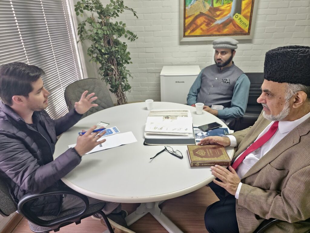 اسی طرح ایک اور کونسلر جناب Edson de Souza صاحب سے بھی ان کے دفتر میں ملاقات ہوئی جس میں مسلم عرب کمیونٹی کے ایک سرگرم نوجوان لیڈر Mr. Jihad بھی موجود تھے۔ اس ملاقات میں حضرت مسیح موعودؑ کی آمد، جماعتی خدمات، مسجد اور قرآن کریم کے تراجم کے حوالہ سے تفصیلی تعارف کروایا گیا۔ کونسلر صاحب نے پرتگالی زبان میں کتاب ’عالمی بحران اور امن کی راہ‘ بطور تحفہ قبول کی اور بعدازاں اس ملاقات کی تصاویر اور ویڈیو اپنے آفیشل انسٹاگرام اکاؤنٹ پر بھی شیئر کیں۔