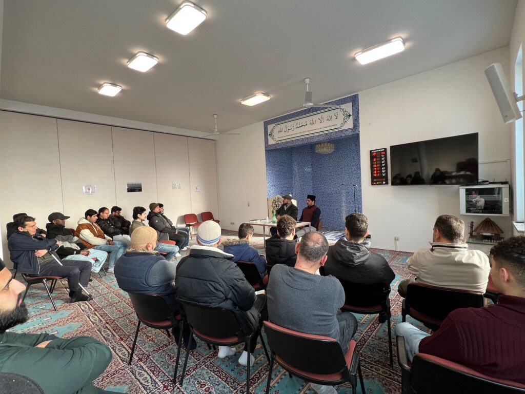 تقریب ایک مختصر استقبالیہ سے شروع ہوئی۔ مہمانوں کا فرداً فرداً استقبال کیا گیا اور اُنہیں ہال تک لے جایا گیا۔ ابتدا ہی سے ماحول نہایت پُر احترام اور دوستانہ تھا اور کئی مہمان شروع سے ہی گہری دلچسپی کا اظہار کر رہے تھے اور مسجد کو دیکھ کر خوش ہو رہے تھے۔ اس پروگرام کی صدارت مکرم حفیظ اللہ بھروانہ صاحب استاد جامعہ احمدیہ و انچارج عربی ڈیسک جرمنی نے کی۔ پروگرام کا آغاز تلاوتِ قرآنِ کریم سے ہوا۔ اس کے بعد مکرم ماذن عقلۃ صاحب نے جماعت احمدیہ کا تعارف پیش کیا۔ بعد ازاں درج ذیل موضوعات پر عربی زبان میں تفصیلی گفتگو ہوئی: آنحضرتﷺ کی پیشگوئیوں کی روشنی میں مسلمانوں کی موجودہ حالت، حضرت عیسیٰؑ کی وفات کا مسئلہ، آمد مسیح سے متعلق پیشگوئیوں کی تکمیل اور عصرِ حاضر میں روحانی تجدید اور اصلاح کی ضرورت۔