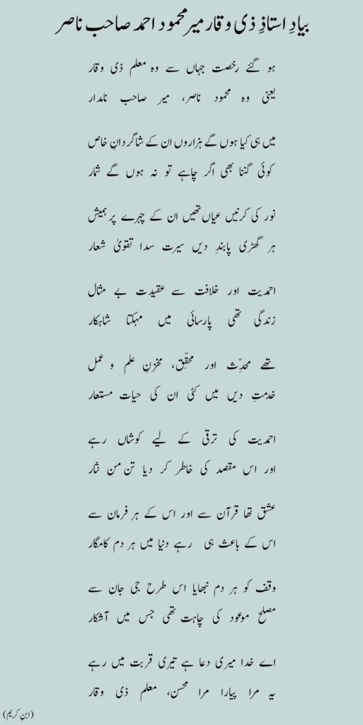 بیادِ استاذِ ذی وقار میر محمود احمد صاحب ناصر