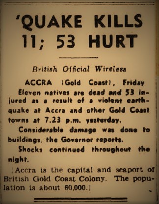 برطانوی نو آبادیاتی دور میں گھانا برٹش کالونی میں شامل تھا اور گولڈکوسٹ کے نام سے جانا جاتا تھا۔ جمعرات ۲۲؍جون ۱۹۳۹ء کو مغربی افریقہ کے ملک گھانا میں ایسا تباہ کن زلزلہ آیا جو اس ملک کی معلوم تین صدیوں میں نہ آیا تھا۔ یہ زلزلہ دنیا میں کئی مقامات پر ریکارڈ کیا گیا۔ ڈیڑھ صد لوگ متاثر ہوئے اور دس لاکھ پاؤنڈ کا نقصان ہوا۔ لوگ خوف و ہراس میں مبتلا ہوگئے۔۱۵۰۰؍گھروں کو انتہائی مخدوش قرار دے کر از سرِ نو تعمیر کیا گیا جبکہ ۶۰۰؍گھروں کو مرمت کے بعد قابلِ رہائش قرار دیا گیا۔ زیادہ تر کچے بلاکس (mud blocks) سے تعمیر شدہ گھر متاثر ہوئے۔نقصان کا پھیلاؤ دارالحکومت اکرا سے تقریباً ۱۰۰؍کلومیٹر تک محیط تھا۔